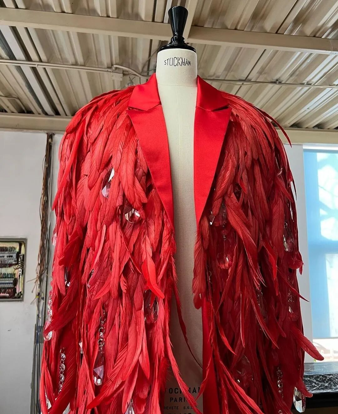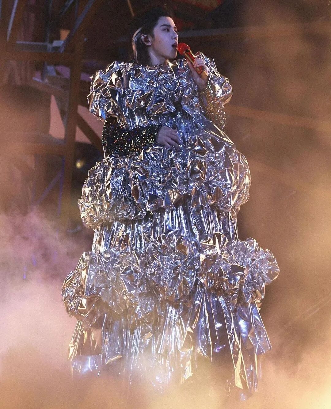 (这件为华晨宇火星演唱会特别定制的长袍,花了至少十天时间,使用了100多米的羽毛和数百颗水晶吊坠。)