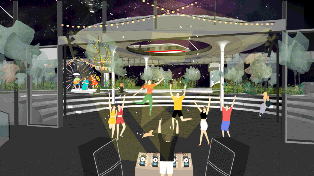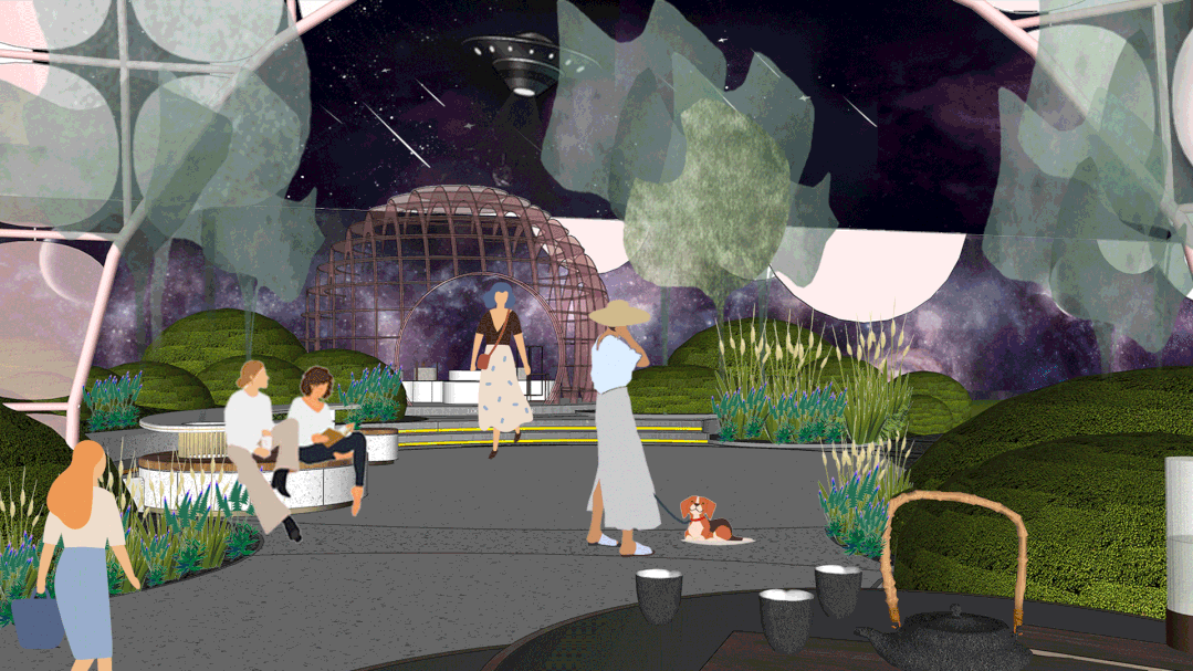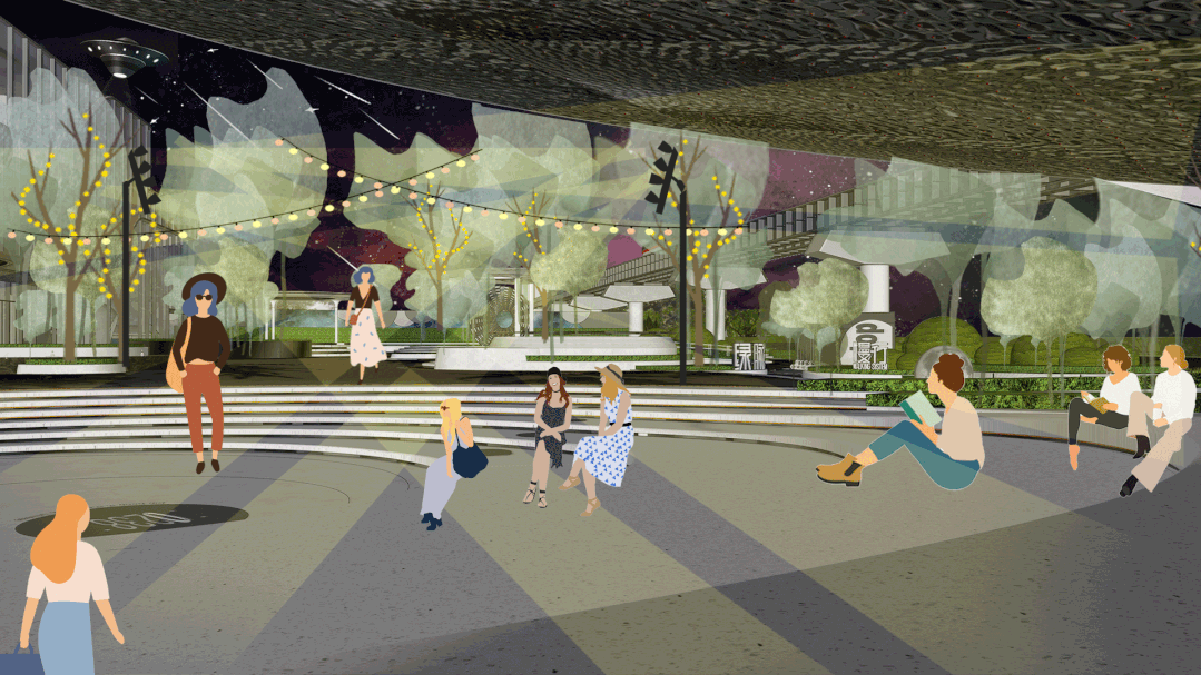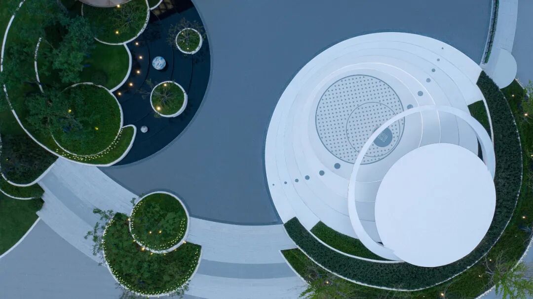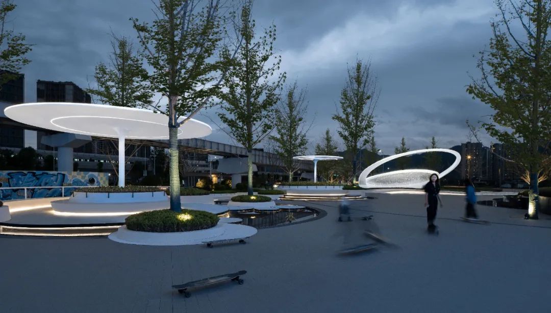 绿谷空间站将具有包容姿态的圆构成重复运用,从平面贯穿道三维立体空间,形成聚合式空间环,生动的场地名片和强烈的空间印象,促进了多维度的社交互动。