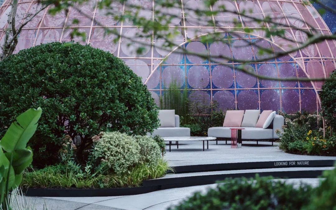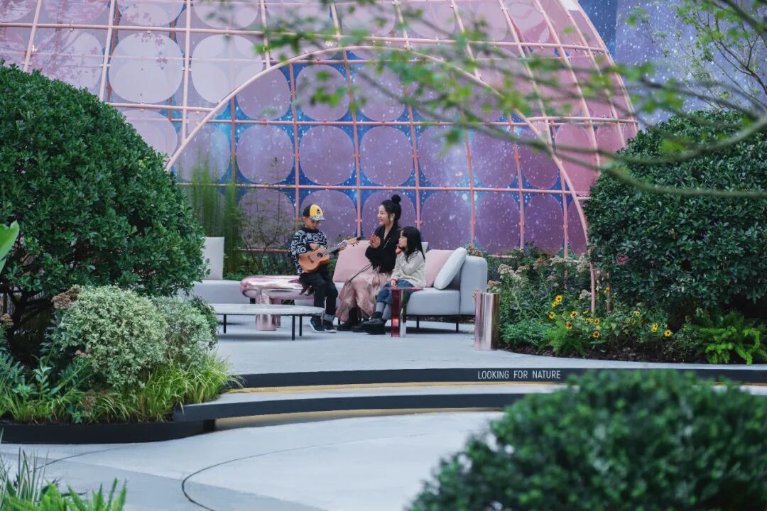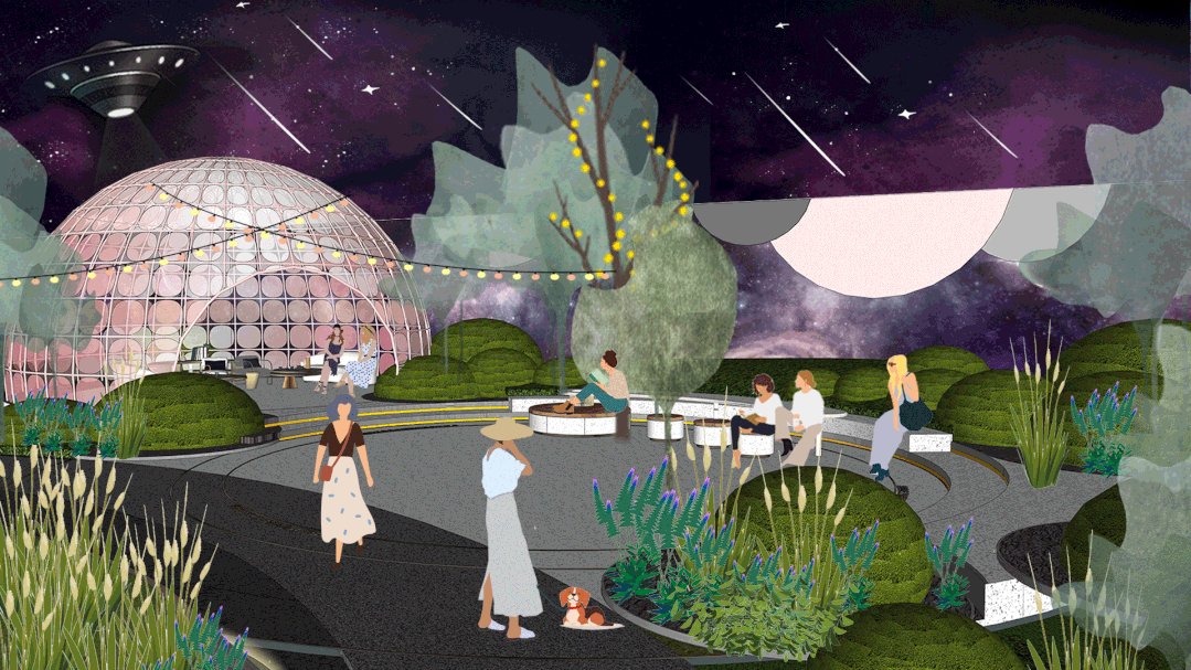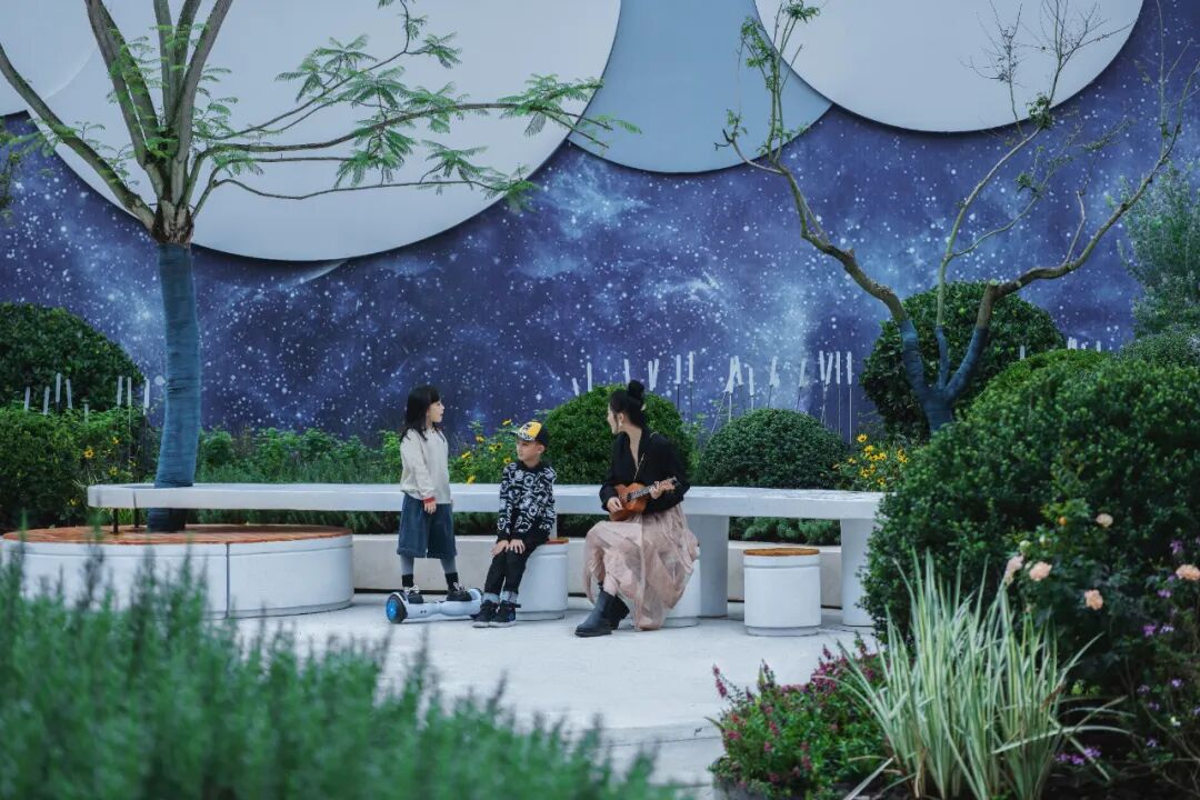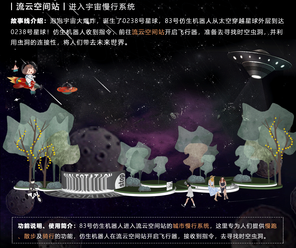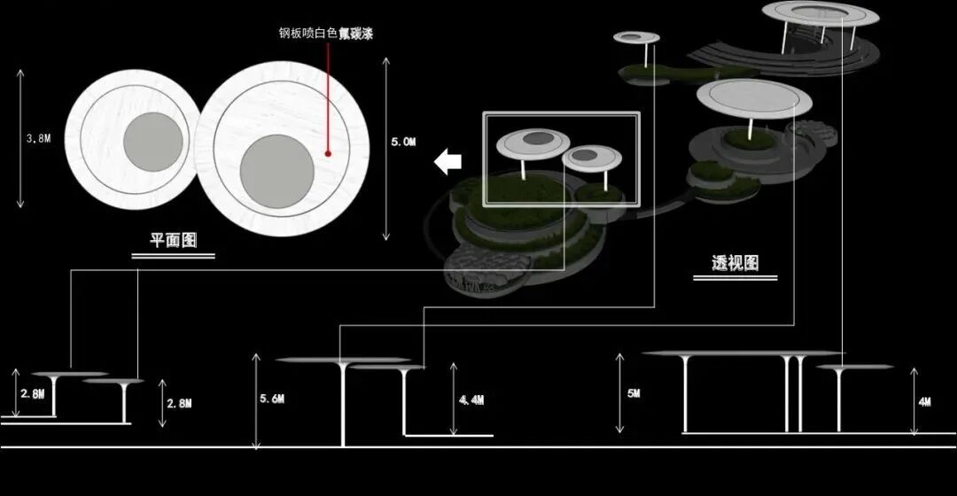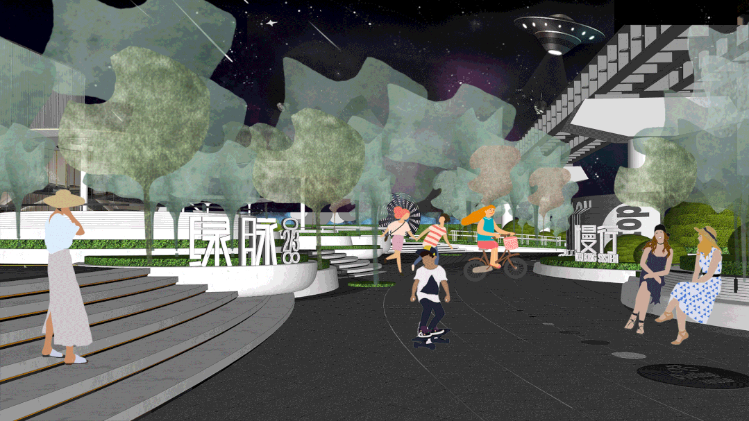 星球的形态演变为一个个圆,环与环相切形成了柔性的场地边界,从而消解了场地狭长带来的局促感,构成的场地与绿化在空间上形成了景观的连续与呼应。