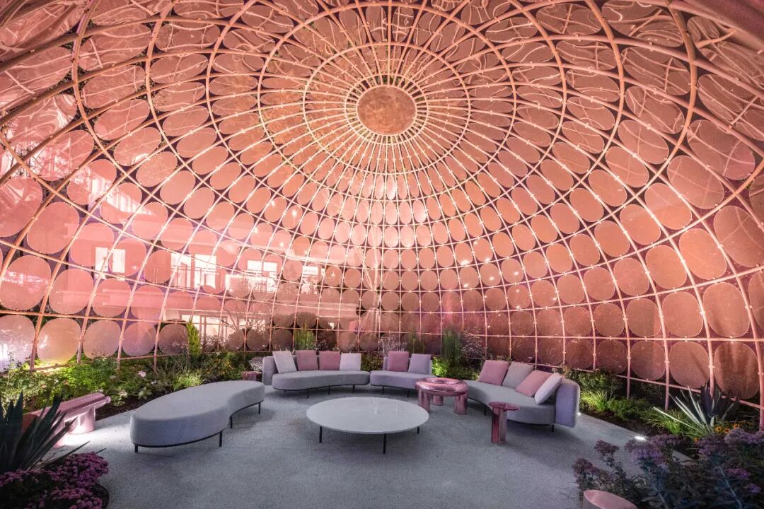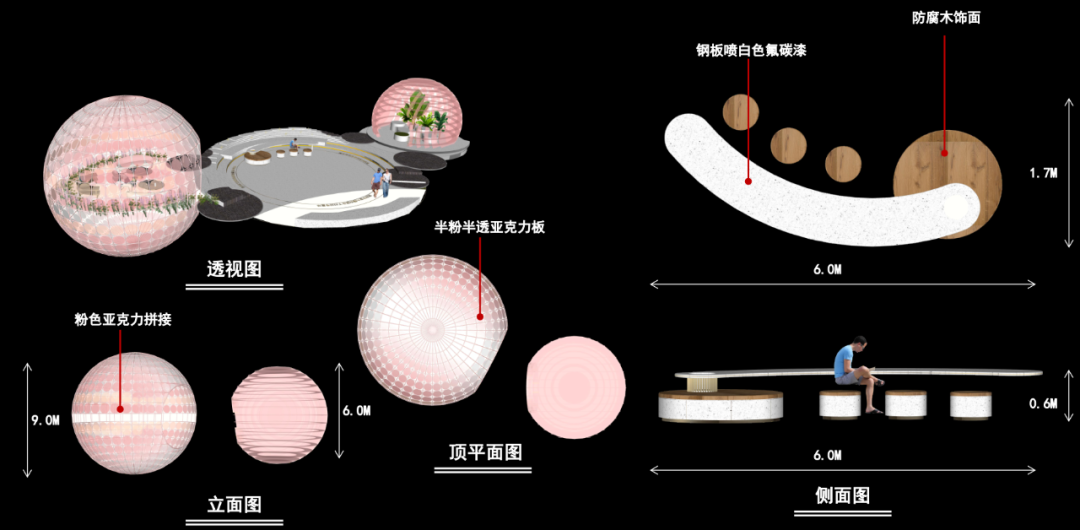 粉色球体构架结构运用直径50镀锌圆管,外喷粉色氟碳漆,定制粉色亚克力板,设计用科技感的材料,半透明的质感,来达到0238星球在宇宙之间若隐若现的效果。