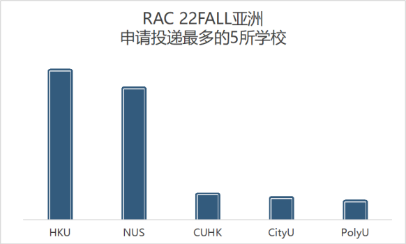 亚洲方面,2021年起“相关地区”影响逐渐消退,2022Fall申请人数在9月选校课后激增,可以称为除英国以外最“卷”的地区。RAC的同学申请主要集中在港大和新加坡国立,相较2022年整体增加了一倍,并且香港中文大学、香港理工大学等相较往年也都有非常多的增长。