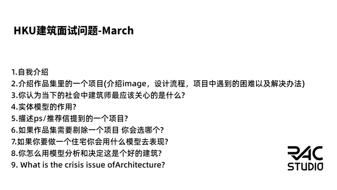 总体面试而言,可以看出,核心问题不再是“为什么申请”、“港大有什么吸引你”等常规问题,更多倾向于作品相关专业领域的理解和设计逻辑,以及未来职业规划,社会问题的关注。RAC的模拟面试也给大家更多的机会了解面试环节的过程以及沟通目的,克服面试恐惧。