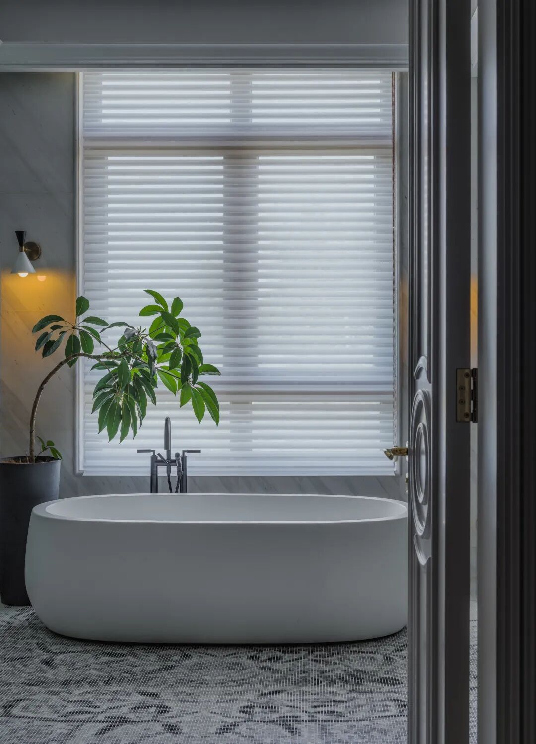 优雅的基调延伸至卫浴空间,心情也一起沉静下来。植物从搬进来那天就在,向光而生,生长出适合的姿态……顺其自然地和谐相处,也是一种生活秩序的建立。