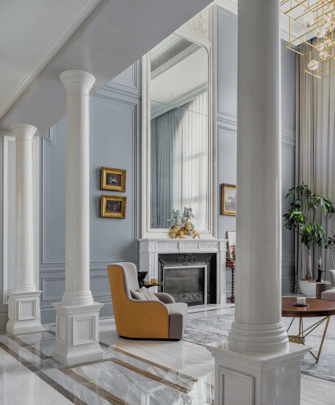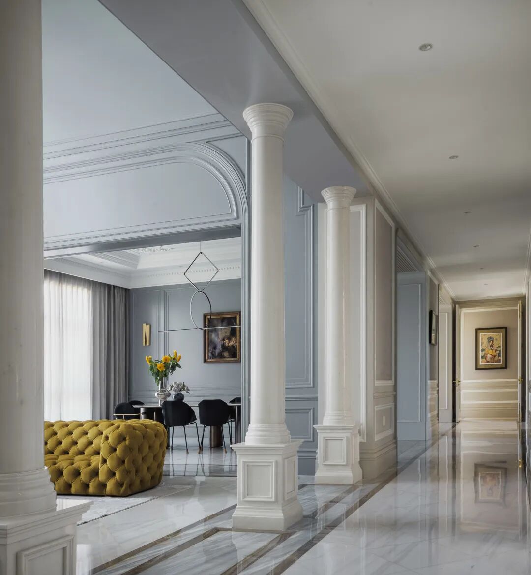 法式元素造型的柱子给客厅增加一层朦胧的边界感,同时让走廊充满了仪式感。