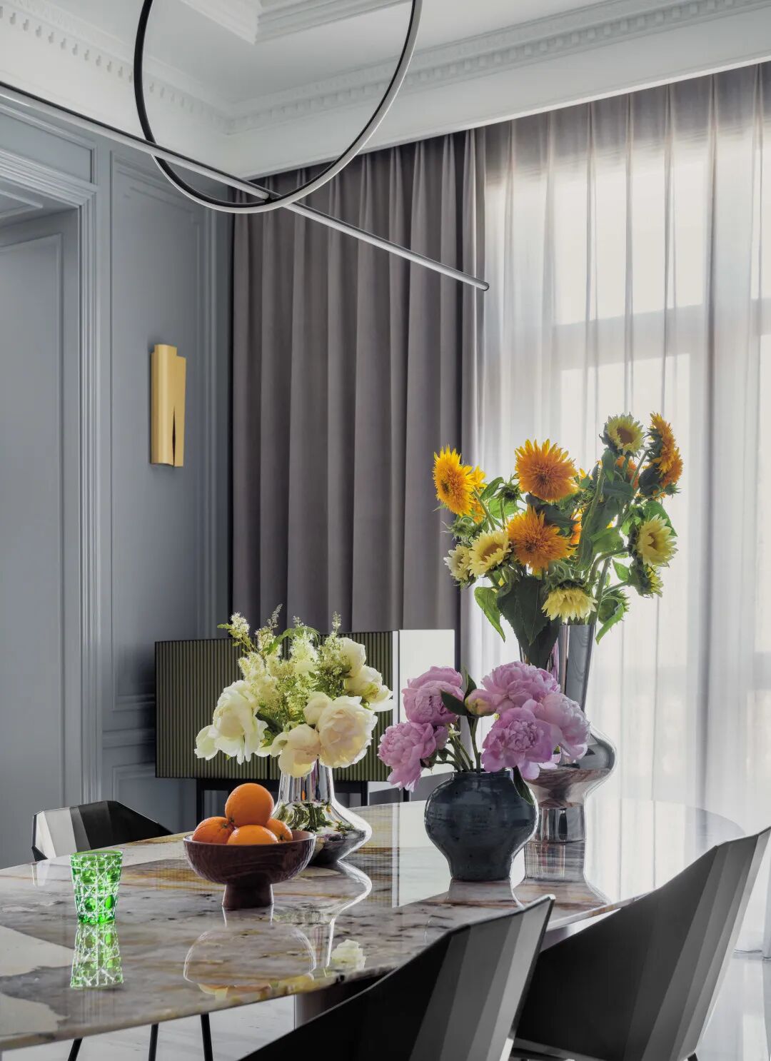 餐区,一束鲜花,与自然相交融,阳光照进,一家人在这样优雅的环境下享用美食,一餐一饭都显得格外幸福。