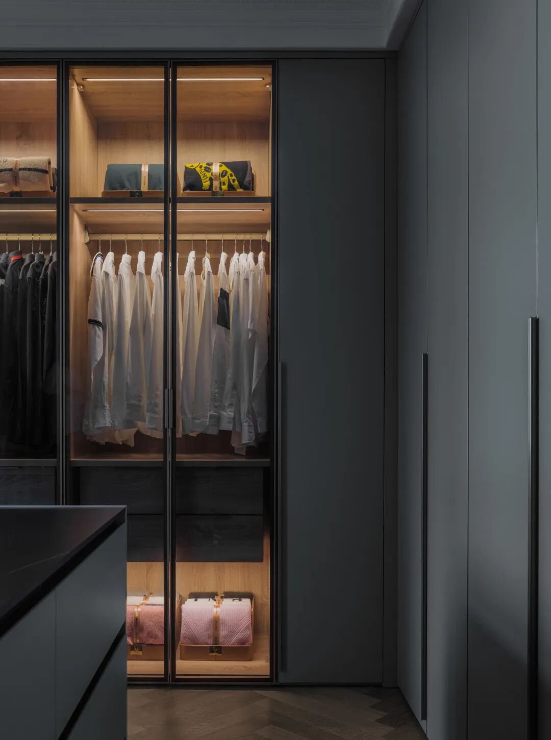 走进主卧衣帽间,更强烈的仪式感和秩序感扑面而来,这里并不拥挤繁杂,不论衣物还是其他配饰,都是舒适且具有品质的款式,按照不同类别、颜色进行收纳陈设。
