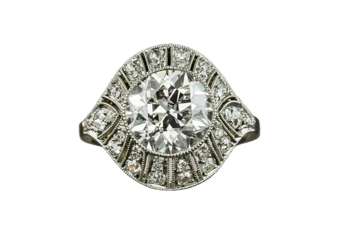 1920年时,流行风格从爱德华时期偏爱的繁复花卉风格,逐渐过渡到装饰艺术时代风格。这时候的订婚戒指,在拥有浪漫的蕾丝镂空底座的同时,开始出现线条感。