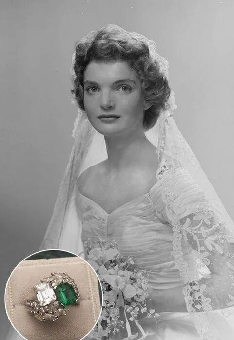 另一位比较出名的名人订婚戒指,来自杰奎琳·李·布维尔,她的“toi et moi”祖母绿和钻石订婚戒指由美国总统杰克·肯尼迪从梵克雅宝定制。