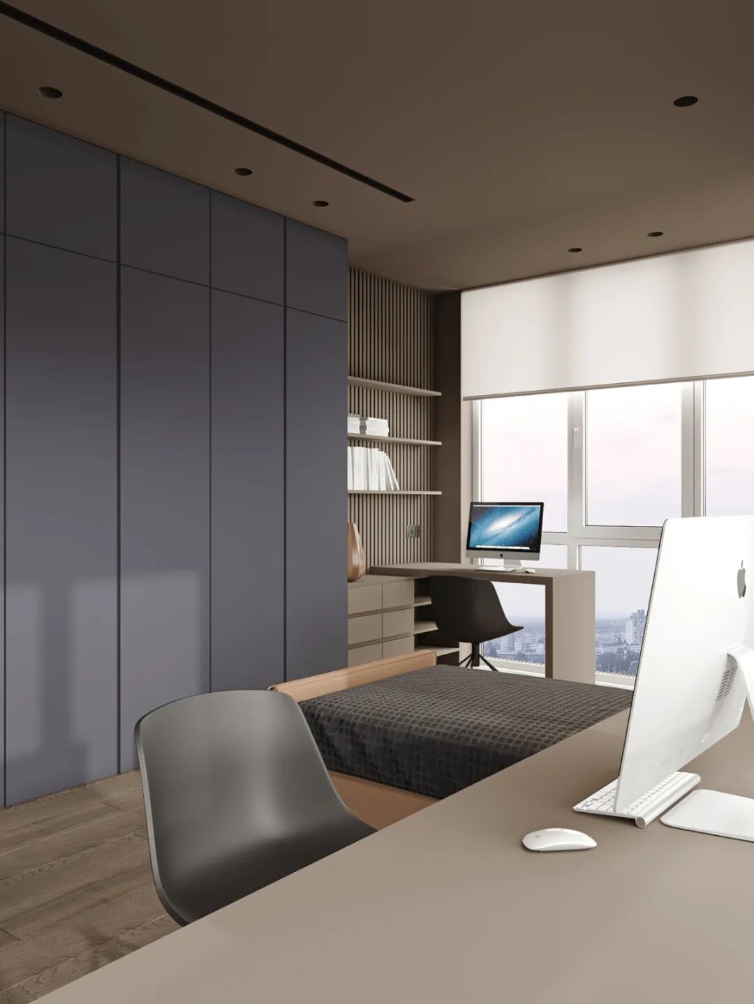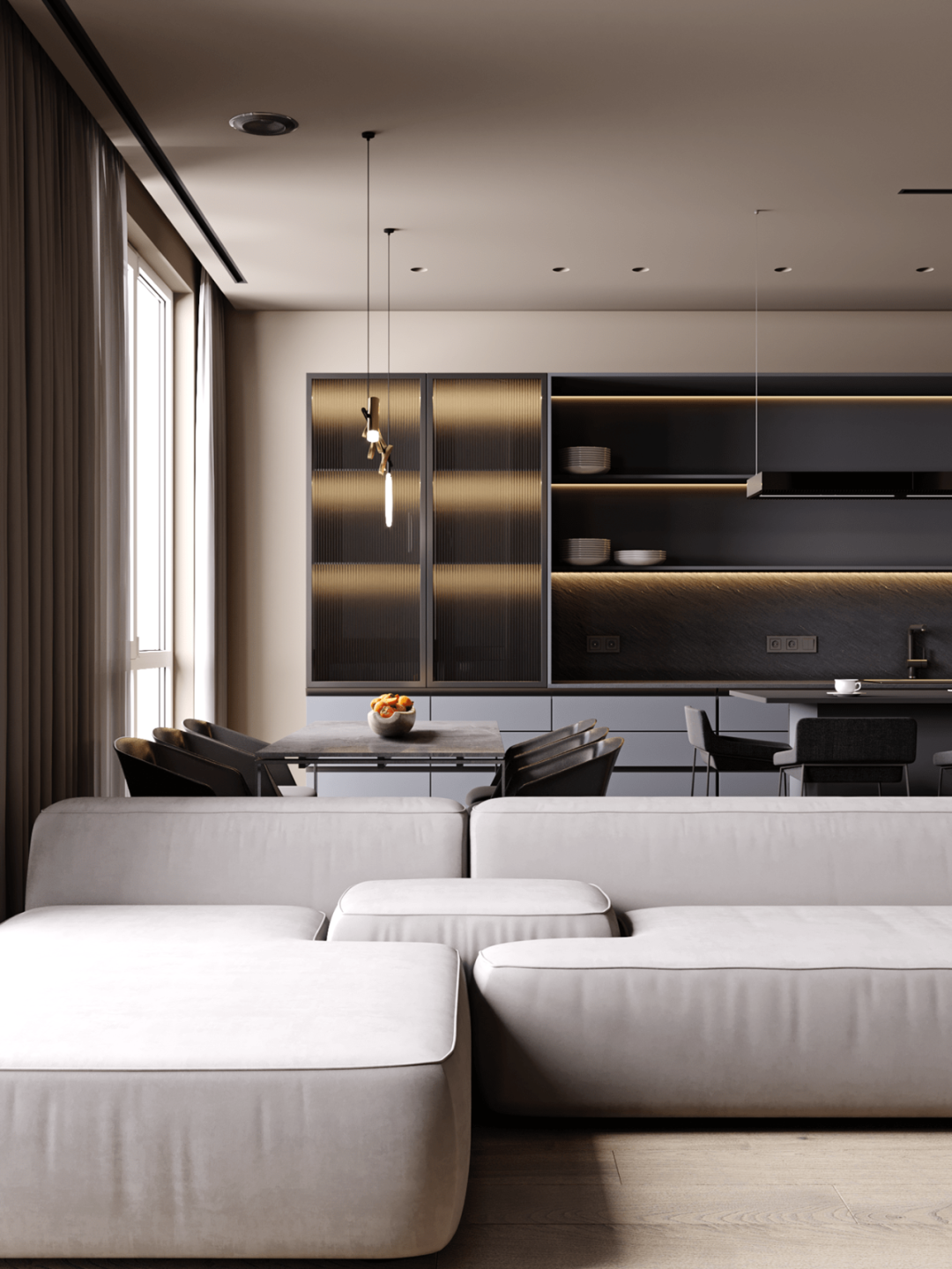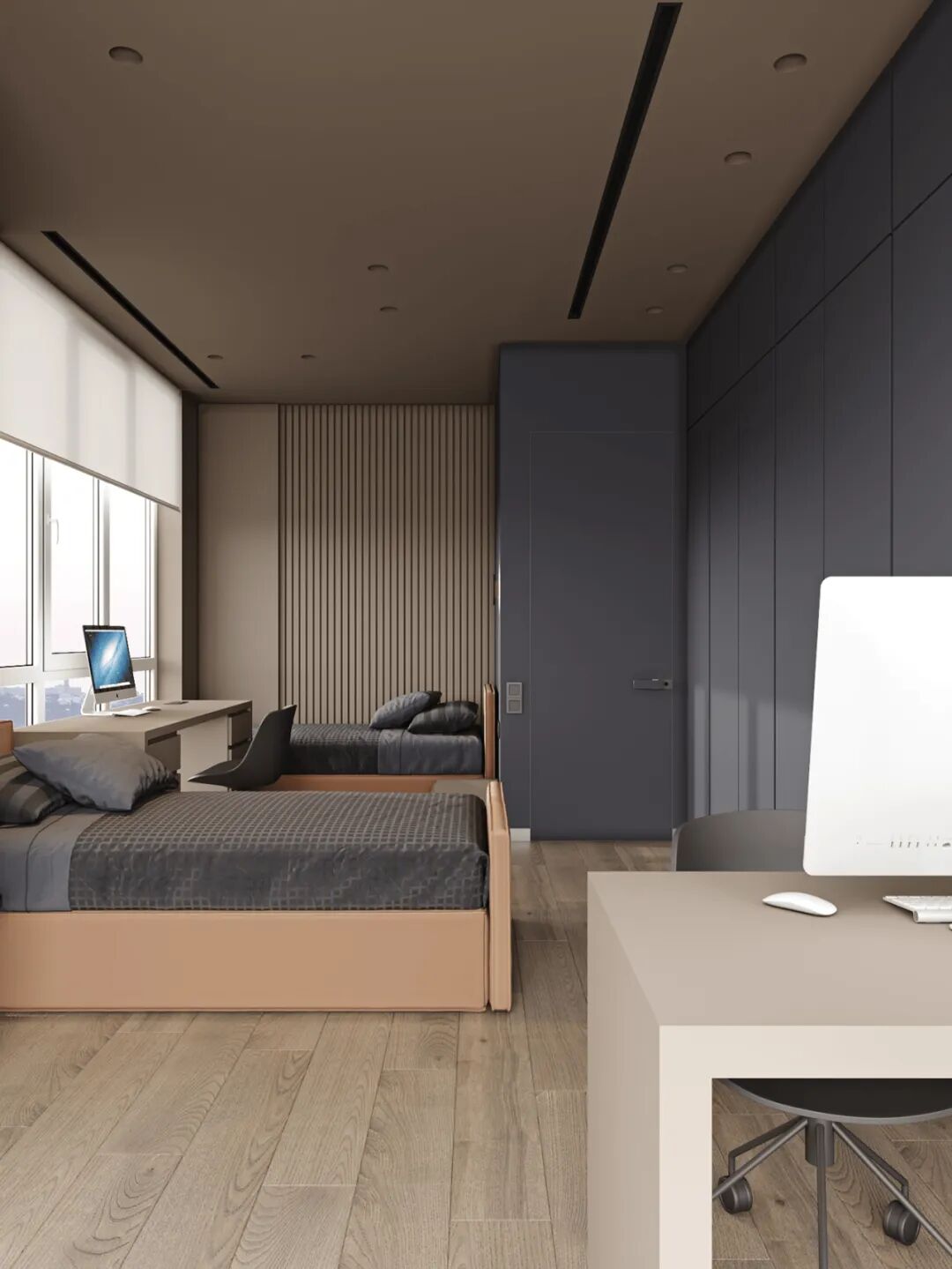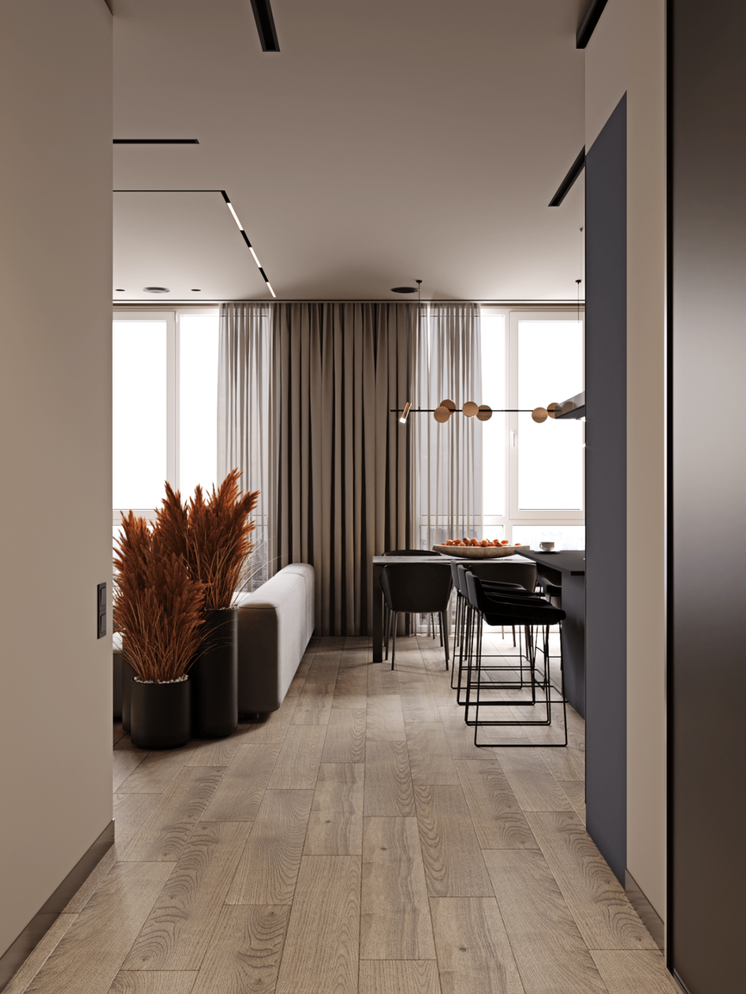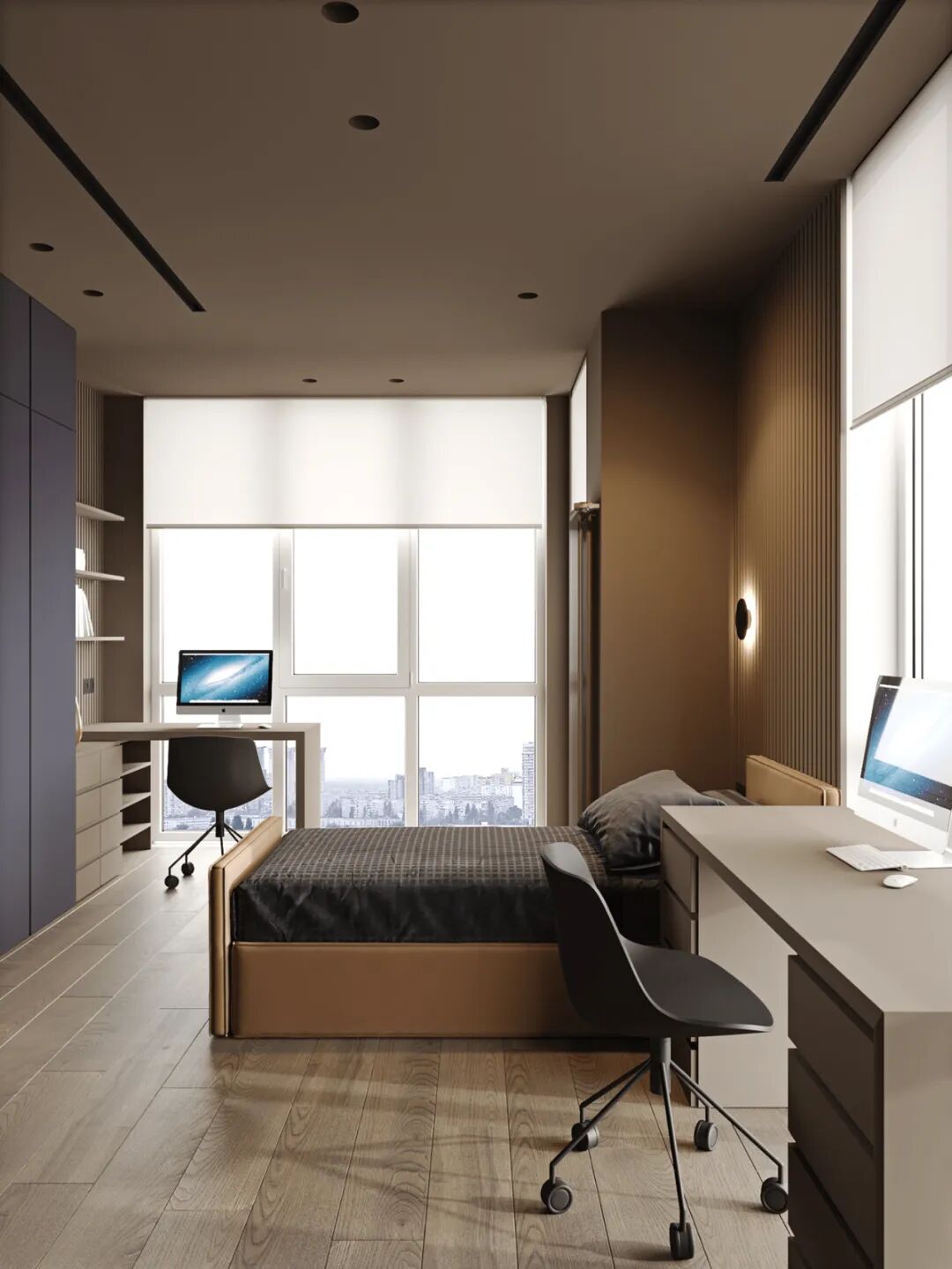 作品集2023-03-17 100㎡现代简约二居室,既有气质,也有个性! 现代空间 DAVIDOVICH design新作,100㎡二居室空间设计,内饰采用暖灰和石墨蓝色调,以及几何的对称元素,展现出一种时尚、沉稳的空间感,既有气质,也有个性,现在越来越多人喜欢这个调了。 客厅现代简约的格调,非常具有吸引力,又好看又实用。配色与装饰,让整个空间质感突出,给空间一种安静、舒适的感觉,除了要满足正常的生活需求外,也要将对艺术的审美得到展现。 客厅的一侧是厨房和餐厅,对设计材料的选择,设计师结合材料的颜色,质地,几何图形和使用规模。创造性的颜色,空间对比与调和的无限结合。 主卧整体色调和客厅一样,石墨蓝作为床头背景,木地板搭配灰白色的床品,大大的窗户搭配着米灰色的窗帘,整个空间光线充足,旁边的收纳柜,简洁大气,同时提供了大量的收纳空间。 深色的主卫空间,水磨石的沐浴间,时尚有艺术的洗手台,简洁大气有档次。 儿童房支持客厅和卧室的设计理念,搭配恰如其分,两张床摆放位置,两张靠窗的书桌位置光线充足,内置衣柜以石墨蓝,完全响应整个空间的色调,但不失童趣、温馨。 设计师 Alexandra 每个项目都将空间的功能、人体工程学为原则。设计结合最新趋势,自然元素、材料纹理等其他元素,给人强烈的视觉冲击。 本文来自微信公众号“亚太室内设计”(ID:ytsnsj)。大作社经授权转载,该文观点仅代表作者本人,大作社平台仅提供信息存储空间服务。 TAGS: 住宅室内现代空间 相关文章Kleoniki Andr…这是大王Day.281获奖作品《2020最佳图书…精选头像|搞怪来袭!安东尼奥·布埃诺 作品配色清新梦幻的场景插画,充…美国Jennifer Mc…【小鹏设计】设计小改/动力…【首发】地点空间丨打破空间…谢商家不坑之恩!只骗有钱人…