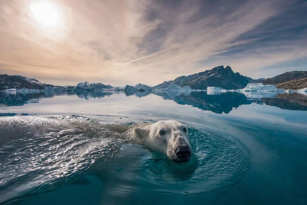 在格陵兰岛的一次远程登山探险中,我乘坐一艘十二生肖小船探索峡湾时遇到了一只好奇的北极熊。在熊潜入冰冷的北极海之前,这一刻只持续了短短的一秒钟。我希望这张照片能将人们带到野外的北极地区,并与这个脆弱的生态系统建立情感联系。