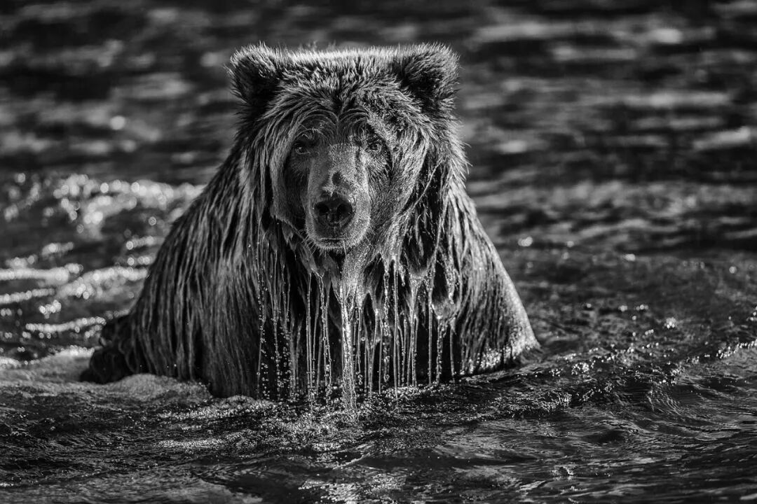 一只雄伟的灰熊从加拿大北部育空地区钓鱼支河水下的浅水区中出现,育空地区是少数几个保护它们免受狩猎的管辖区之一。这些熊在大量的鲑鱼到达这里产卵后潜入水中,但众所周知,它们讨厌将耳朵浸入水中,因为聆听是它们最敏锐的感觉(嗅觉是近在咫尺,视觉是远距离)。