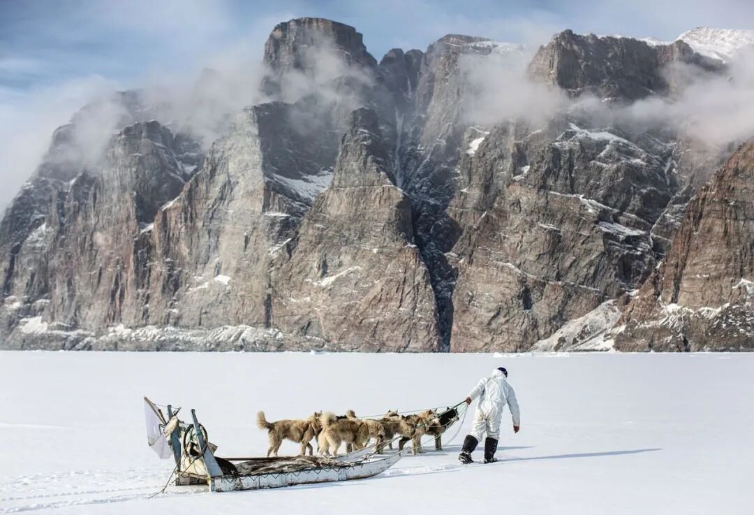 穿着北极熊毛皮裤和海豹皮夹克抵御北极寒冷,穿着白色制服的 Uunartoq Løvstrøm 跟踪一只海豹。由于气候变暖,海冰比以前形成得更晚、融化得更早,从而缩短了狩猎季节。