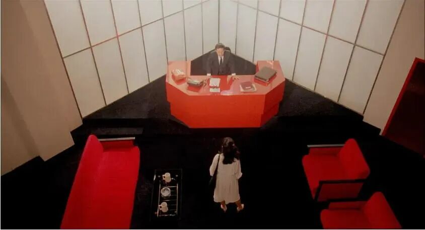 而在场景的布置上,同样通过大片的、对比强烈的白、黑、红的颜色搭配,营造出了超现实主义的色彩。