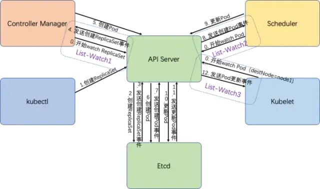 业务在组件之间的控制流的交织形成了K8s的控制面。本节主要讨论控制面中几个较为有名的过程。