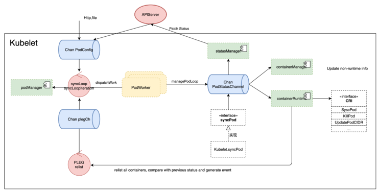 这里展示的只是Kubelet中的SyncLoop过程,而Kubelet中的PLEG、自动过程、Informer、垃圾回收过程等都与syncLoop相关。Kubelet 的工作主要是围绕一个 SyncLoop 来展开,借助 go channel,各组件监听 loop 消费事件,或者往里面生产 pod 相关的事件,整个控制循环由事件驱动运行。可以用下图来表示: