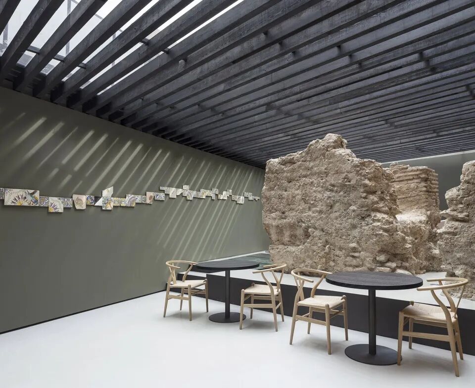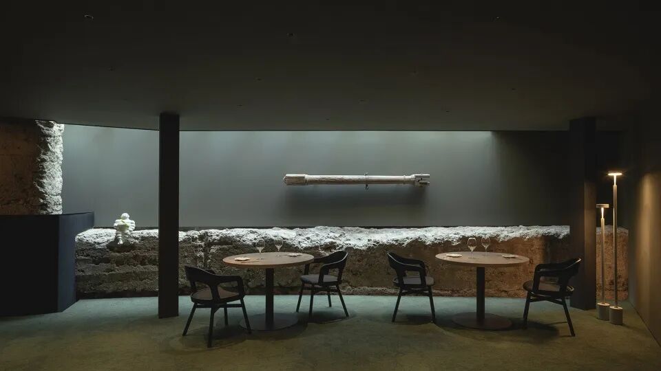 在餐厅进行了形象和配置的更新后,客人们仿佛成为了在特定场景中追溯城市历史的演员。餐厅入口和过渡区域摆放了一系列欢乐的、符合人体工程学线条的家具。随后是前菜用餐区,这里的桌子都被放置在主厨的操作吧台前。玻璃屋顶覆盖着大量黑色橡木条,自然光透过缝隙散落在餐厅的各个角落。两种风格的分布以巴伦西亚古阿拉伯城墙的遗迹为标志,它在12世纪划分了城市的边界。餐厅的外立面基础和瞭望塔环绕着一个可用于小型活动和会议的房间。
