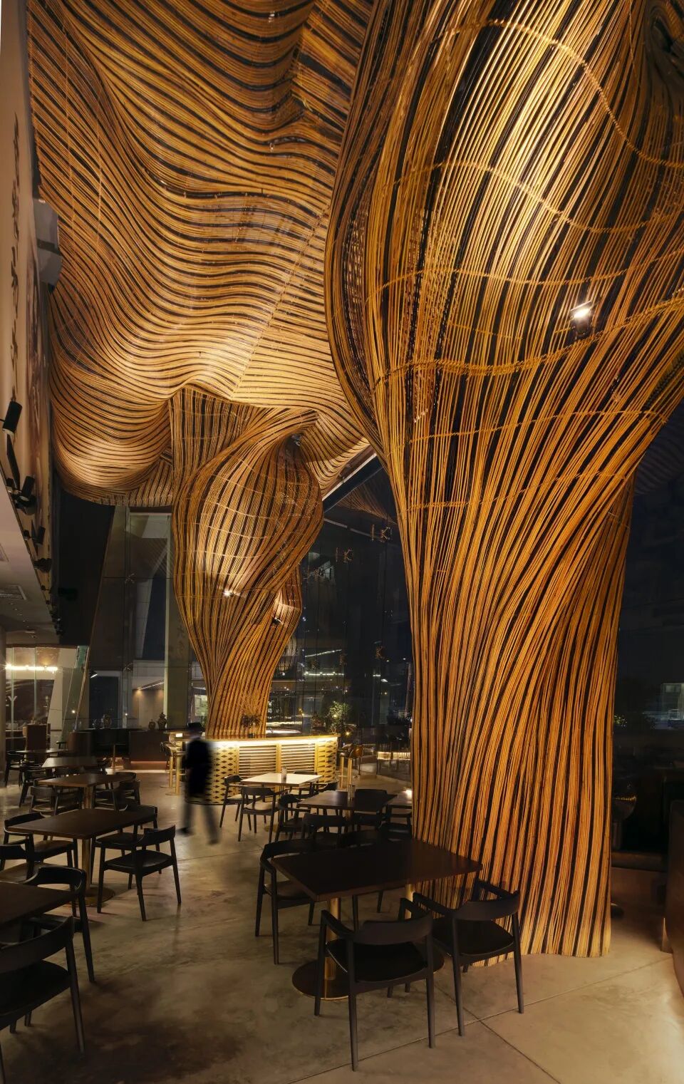 设计团队以其标志性的风格融合了3D数字技术和传统工艺,将天然可再生的藤条置于30米高的空间中。藤条形成自由流动的液体形状,模拟倒入玻璃杯中的啤酒,其设计美学强烈地突显了这里作为比利时精酿啤酒指定餐厅的定位。宽大的藤柱完美地衬托出印有三姐妹的背景墙,这是对四川美食的双重肯定,菜品与餐厅供应的啤酒相得益彰。尽管餐厅在视觉上给人以冲击,但它实际上遵循了赖特的理念:“形式和功能应当在精神上高度统一”,将喷金漆的藤柱的内部空间用于存放酒管、空调以及其他相关设备。