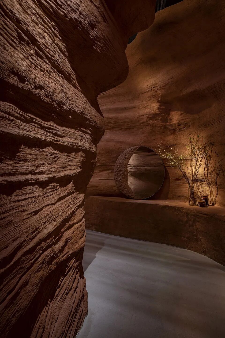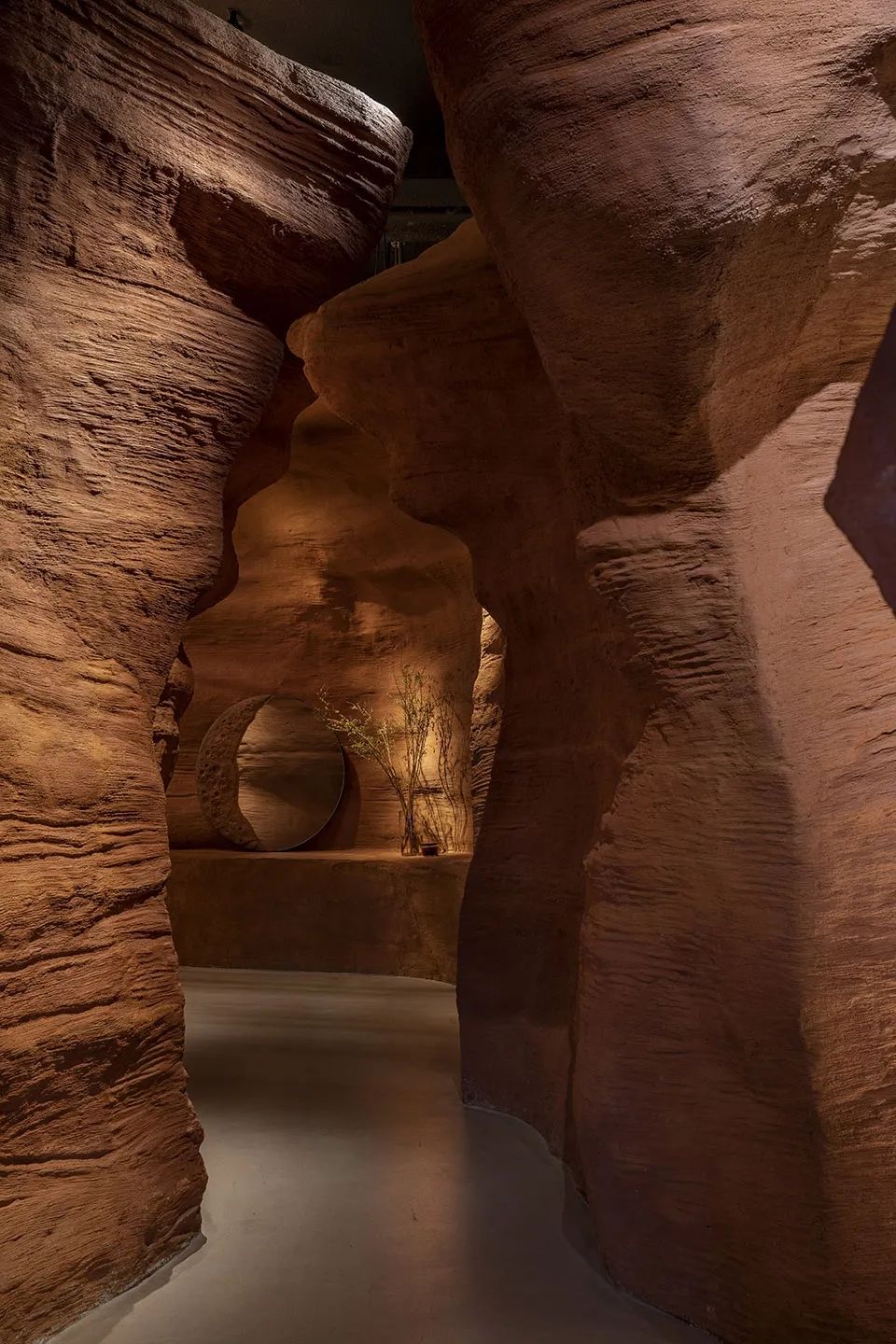 技术上如何有效把控并实现原初空间构想;如何实现原始力量感与现代感的平横;如何携同匠人们对装饰混凝土造型及着色进行实验。如勒内·德勒兹所言人生就是一场遇见,人们在非常现代化的都市、现代的综合体楼内,遇见一处充满粗糙质料的、原始的空间,会暂时抽离于周边环境;在峡谷空间中穿梭、遇见、互动、用餐,尽情体验这种既原始又现代的氛围空间。
