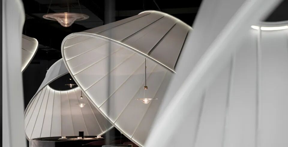 画面一直徘徊在脑海中,我试着把这种画面的氛围带到创作中,于是在空间中搭起一个又一个的帐篷,我希望帐篷的形态像贝壳一样光亮。星盘灯光错落有序点满天空,用灯的光影投射出水波纹,我希望打造的这个空间中就餐能体验到一种孩童般的浪漫与快乐。“生活贴得太近就会疏远灵魂,灵魂贴得太近就会疏远生活,”喧嚣人世,茫茫人海中间,唯诗与远方乃佳境。