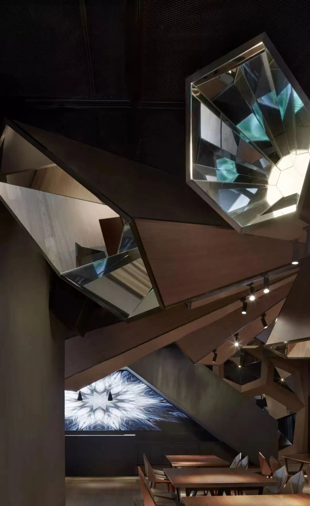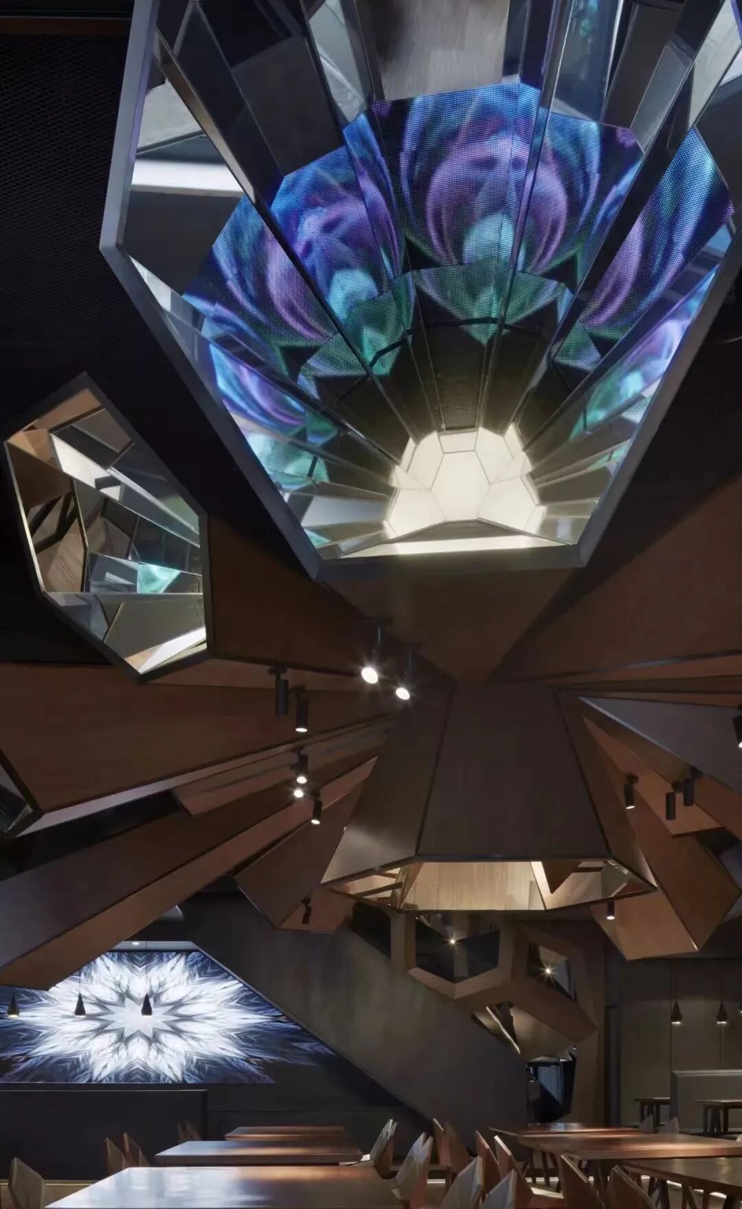 空间以意念的绽放为主题,沉浸式的情感体验为输出模式,悬吊于中央顶部呈爆炸式的光影万花筒装置为三维空间的主要表现形式,进而影响和控制整个空间的光影和调性氛围。