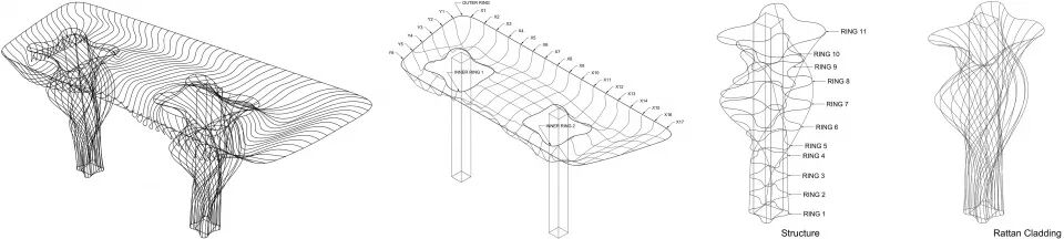 项目位于曼谷河畔,业主的理念十分明确,即引入创新和生态意识,使新品牌在当地达到国际设计标准。设计概念围绕几十年前出生在四川的May,Zaza和Fei三姐妹的冒险经历展开。随着设计团队对故事的深入探索,设计逐渐形成叙事性,他们用自由流动的、雕塑般的藤条结构组成的复杂网架连接过去和现在,如同三姐妹的故事一样令人陶醉。