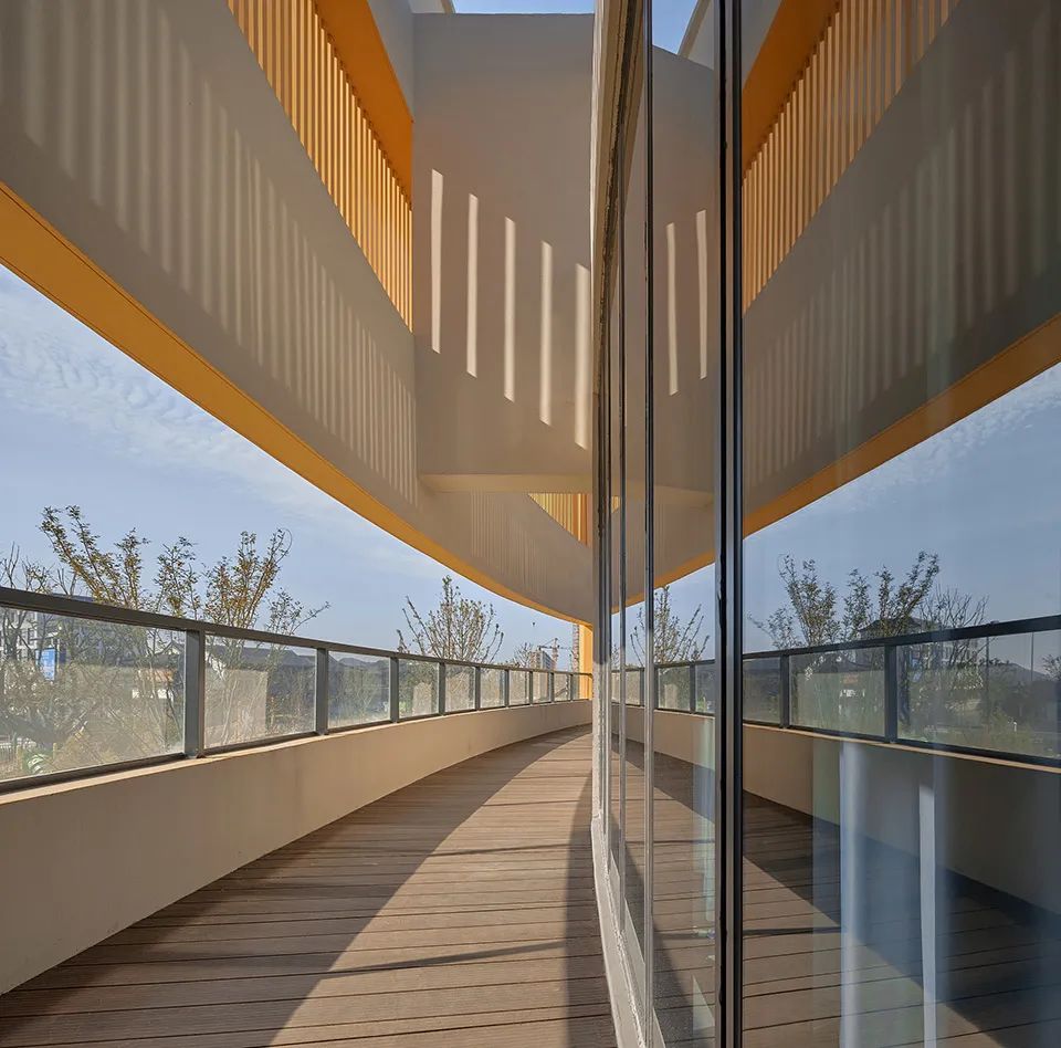 本园最大更新亮点是将原有跑道转译为空中廊道——“把地上的跑道移到空中”。保留少体校的大草坪,抬起的廊道串联建筑和场地。空中廊道既是活动空间,又是游戏观光空间,赋予建筑更为丰富的功能平台,形成灵动立体的生活学习环境。