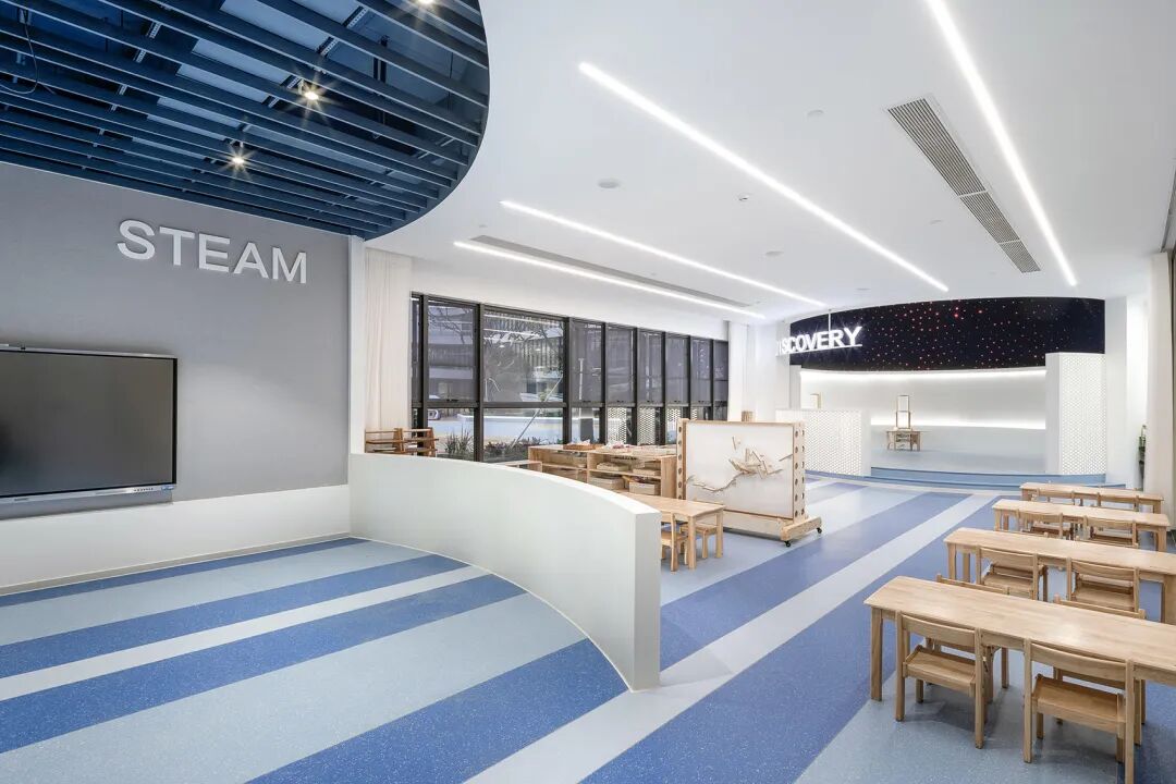 在紫领长兴幼儿园项目中,品牌提出了“把世界搬进幼儿园”的办学愿景,借此,设计师以“博物”的概念做了解读,用视觉语言、氛围场塑造以及空间体验的策略性设计去叙述品牌的故事,呈现品牌的育人理念。
