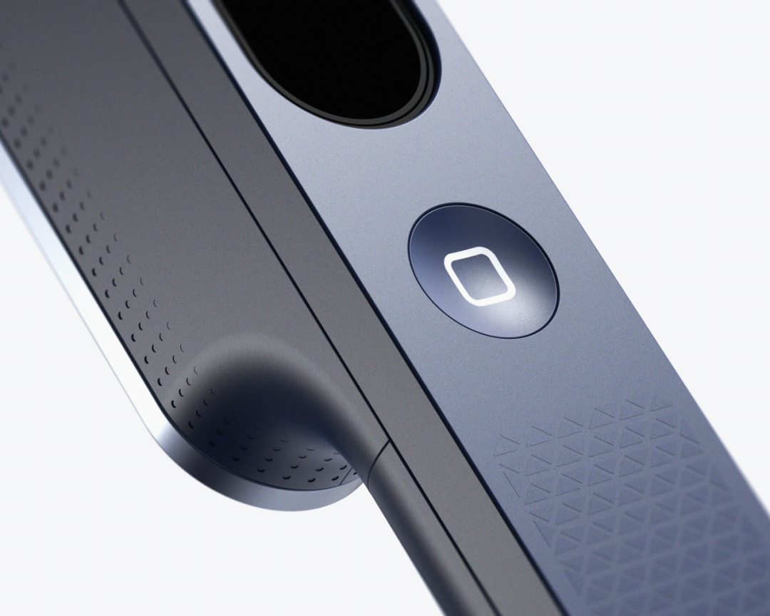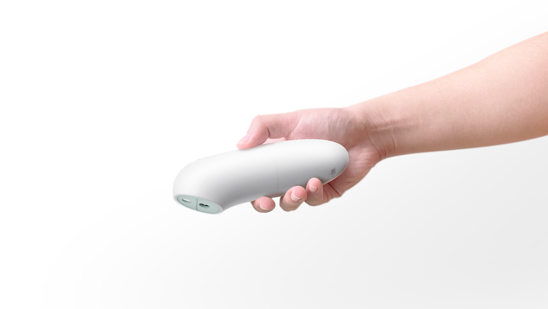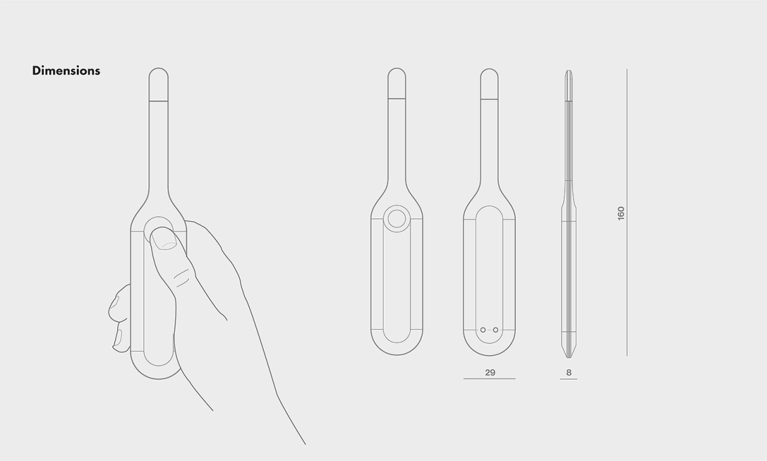 POAEGG是一款体温测量仪,圆润的饼状形体尽可能的弱化了产品的指向性,形态的几处凹陷符合人机,同时改变了使用者的操作手势,从具有"攻击指向性"的持枪手势变为“展示”“传递”的指捏手势。