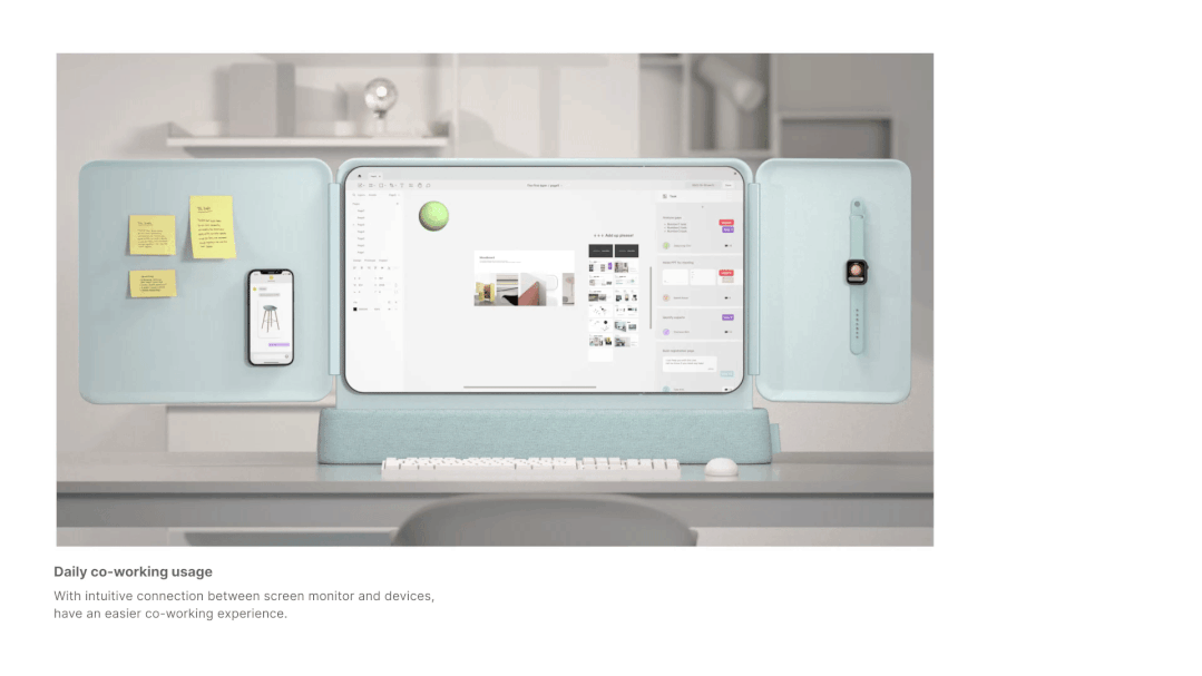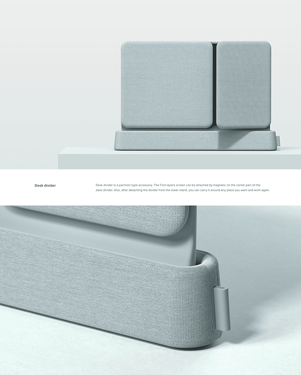 “The First layer”是一款远程办公显示器设计,以提高室内显示器的移动性。它由屏幕监视器、桌面隔板和手推车组成。让人们不再只在一个地方工作,而是根据不同的心情和情况不断移动空间的新生活方式。