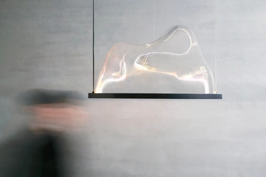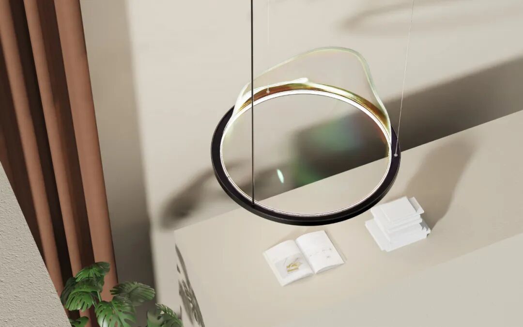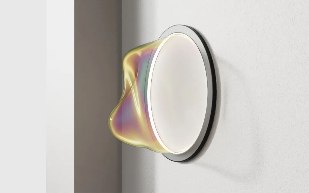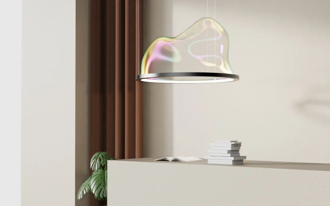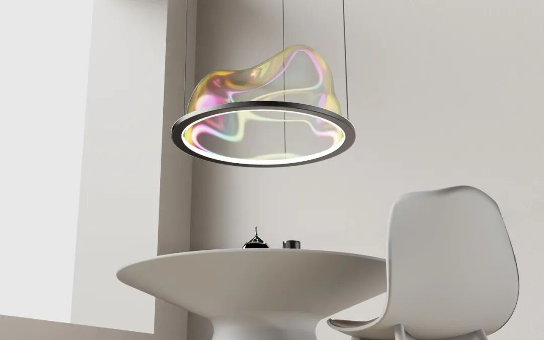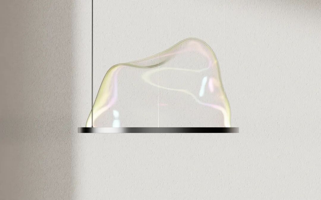 黑色铝环内嵌LED灯带,向内侧发光,满足上下照明需求。气泡是使用传统的吹制玻璃生产的。表面随机柔和的凹凸不平和彩虹色在其表面上呈现出不同的光表达。