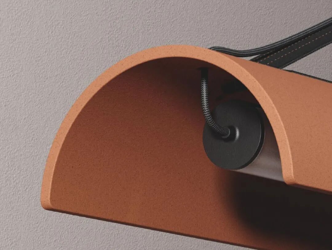 该设计以拱形陶瓦屋顶瓦片作为原型,设计了一系列台灯和吊灯。台灯以一个小托盘为底座,通过镜像灯罩的弯曲内部轮廓而创建。赤陶色灯罩与铸造金属和重型织带等元素相结合。