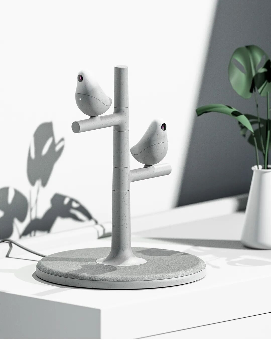 BUDDY home cam 将大自然的友好与快乐融入监控设备。区别于以往监控冰冷的造型,设计师寻找了一种新的设计形式,采用小鸟和树枝的形象。放置小鸟监控的树枝支架可以360°旋转,根据用户的家庭环境和需要进行定位。