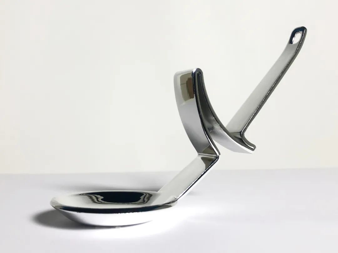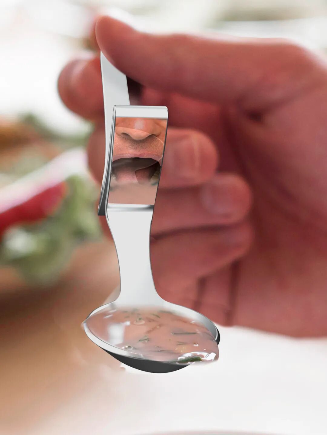 这是一款镜面勺子,可帮助口腔不敏感的患者。许多老年人和头颈癌患者患有口腔不敏感的问题。由于下巴麻痹和咀嚼障碍的影响,他们需要对着镜子吃饭。通过这样的设计,用户在吃饭的时候可以在镜子里看到勺子和嘴巴的位置,让他们吃起来更轻松。