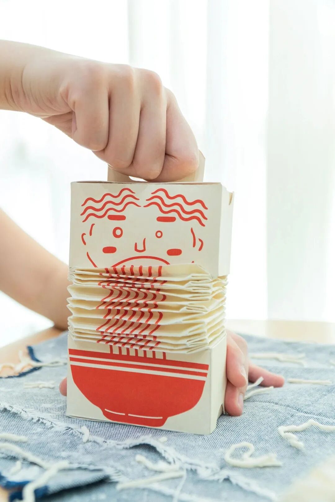 Pull it 包装的灵感来自面条师傅将面团拉成多股面条的方式。同样以手风琴乐器的形式敲打,压缩和扩张的动作激发了对拉面制作过程的想象。类似弹簧的机制也反映了手工面条的嚼劲。