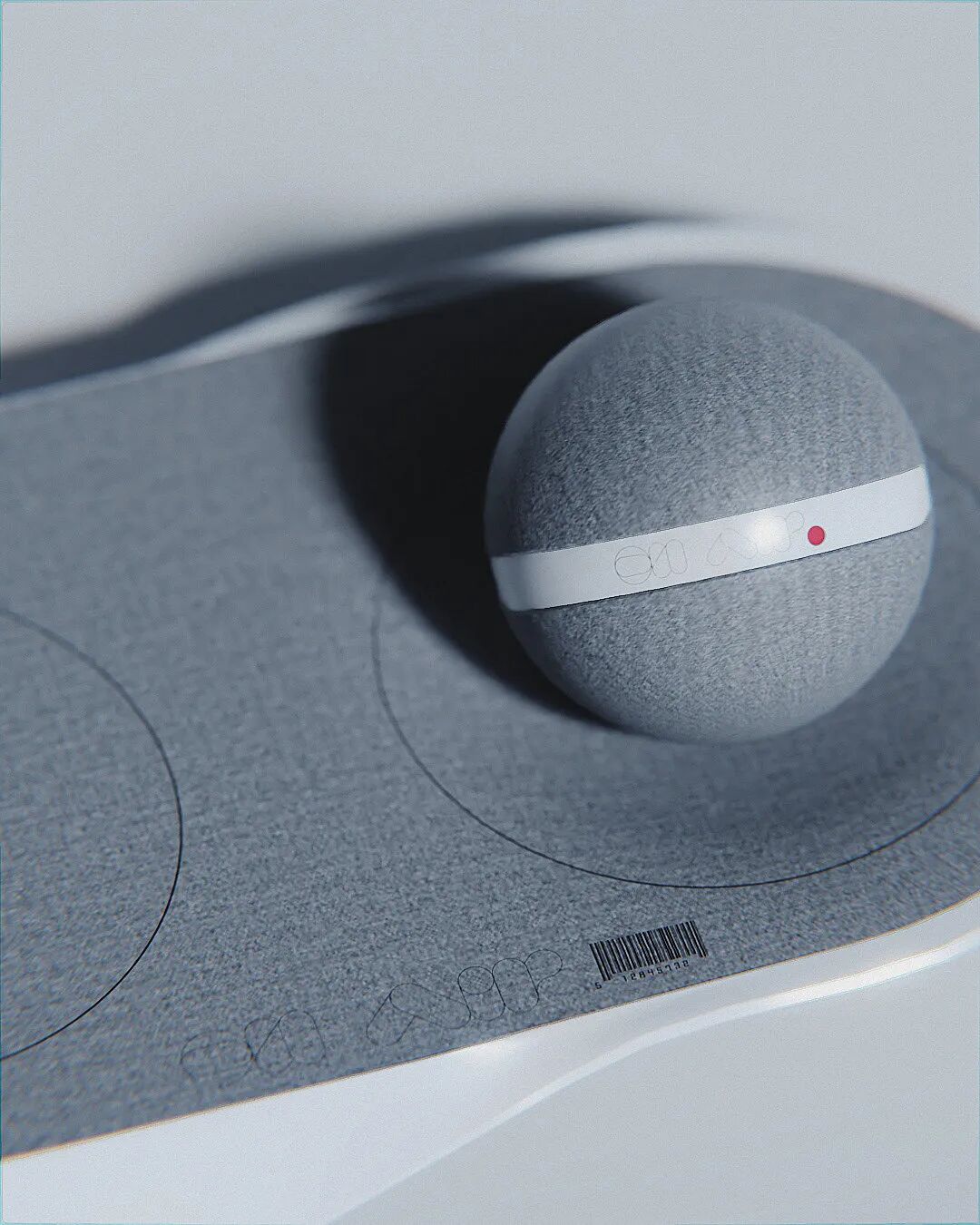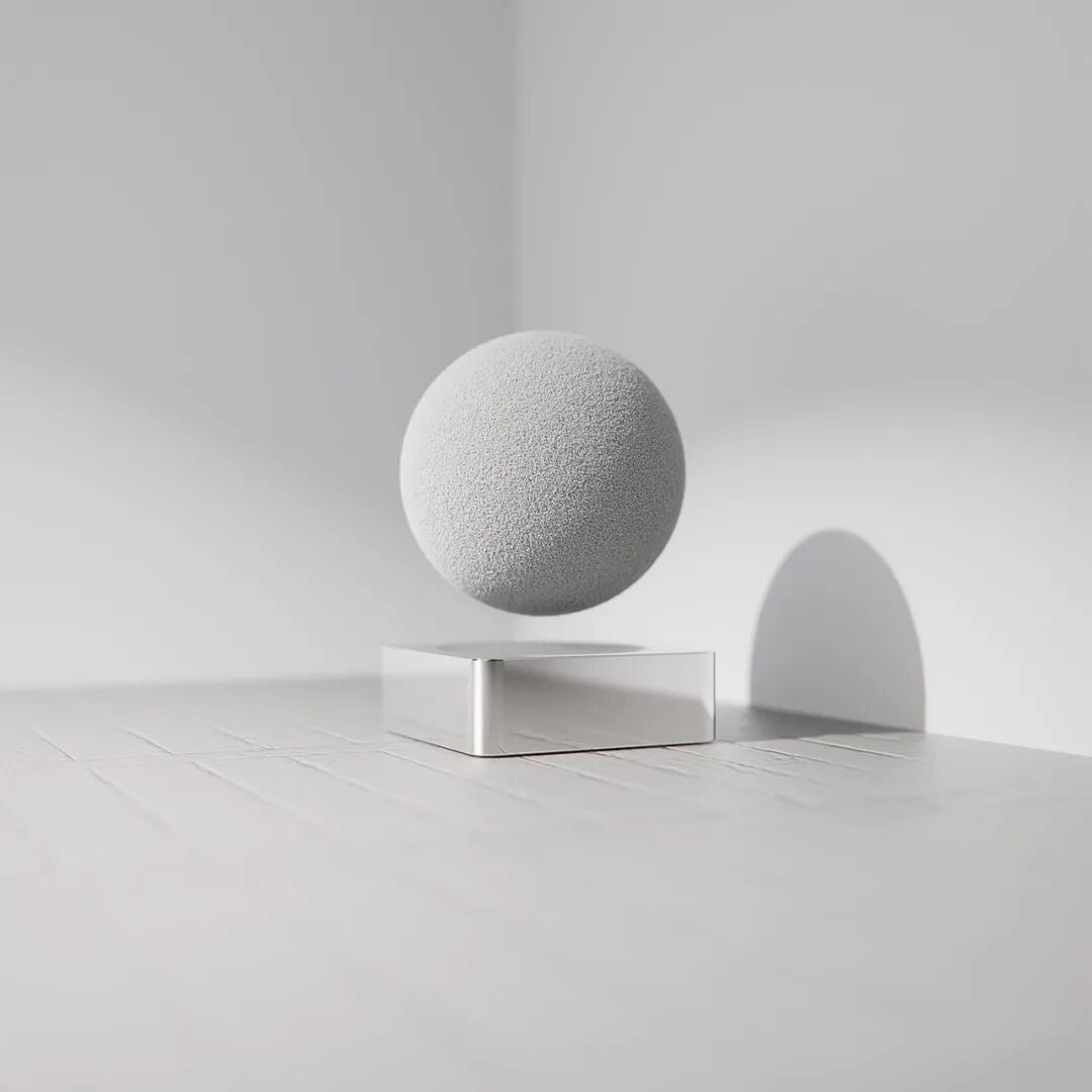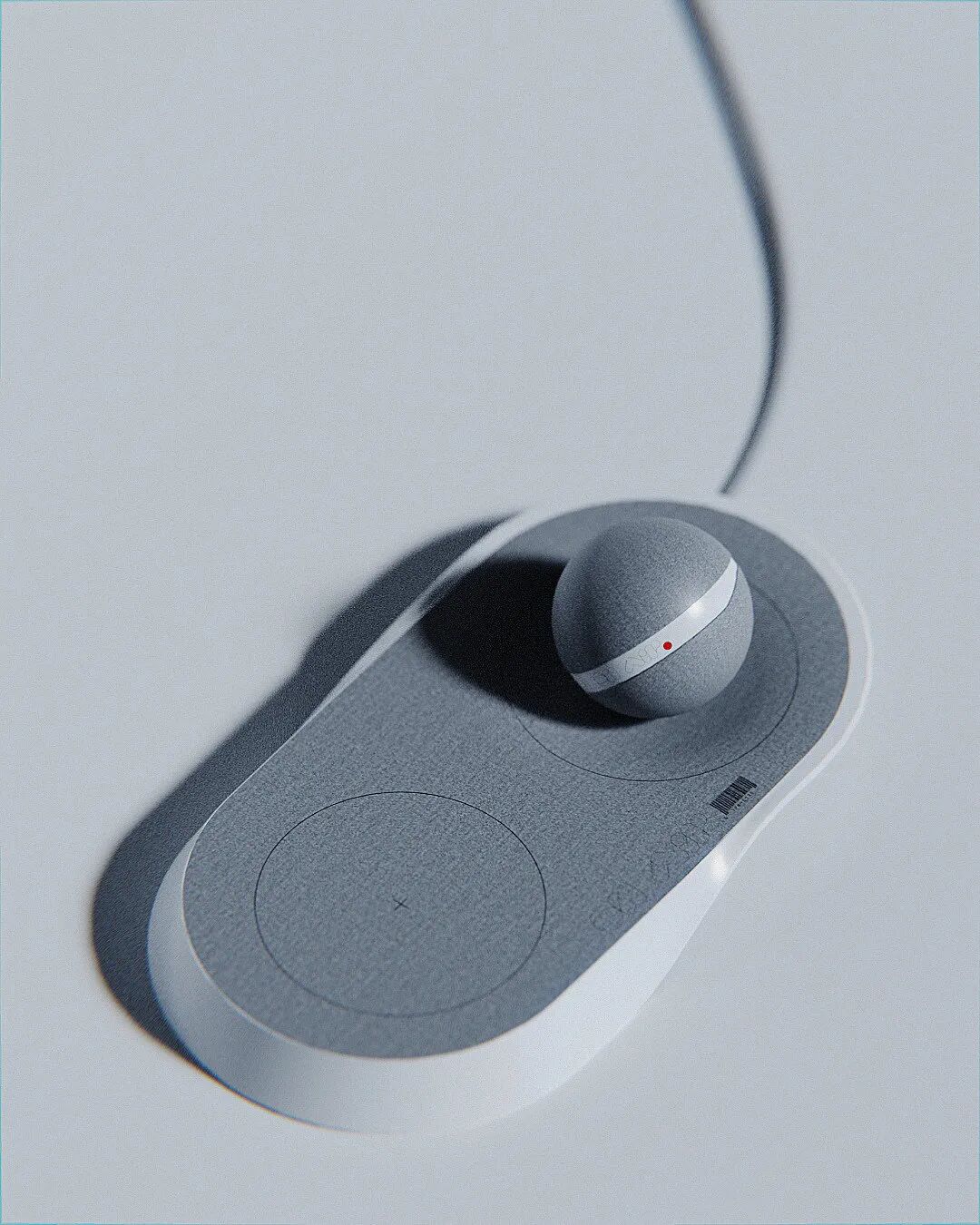 这是一款悬浮智能音箱设计,这种悬浮的智能助手概念让智能音箱更具未来感。它与大多智能音箱不同,盘旋在金属底座上方的球体上覆盖着一种看起来粗糙的材料,除了唤起对悬浮在空中重物的惊奇感之外,略带粗糙的纹理与下面光滑而有光泽的盒子形成了令人满意的视觉对比。