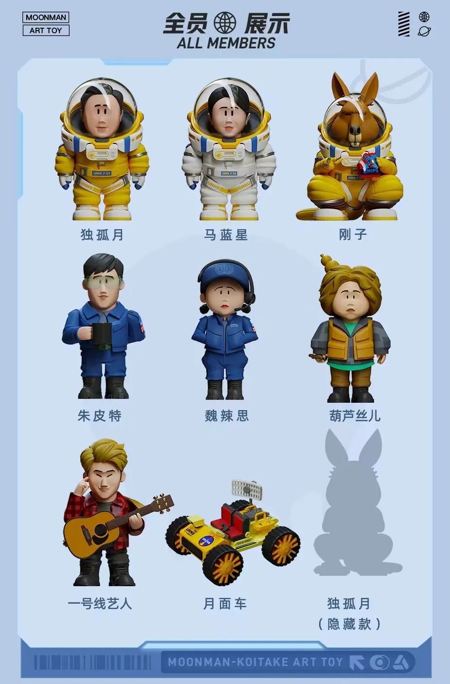 共计9款手办(含一个隐藏款),分别是:独孤月、马蓝星、刚子、朱皮特、魏辣思、葫芦丝儿、1号线艺人、月面车,隐藏款则是独孤月扮演的女袋鼠。