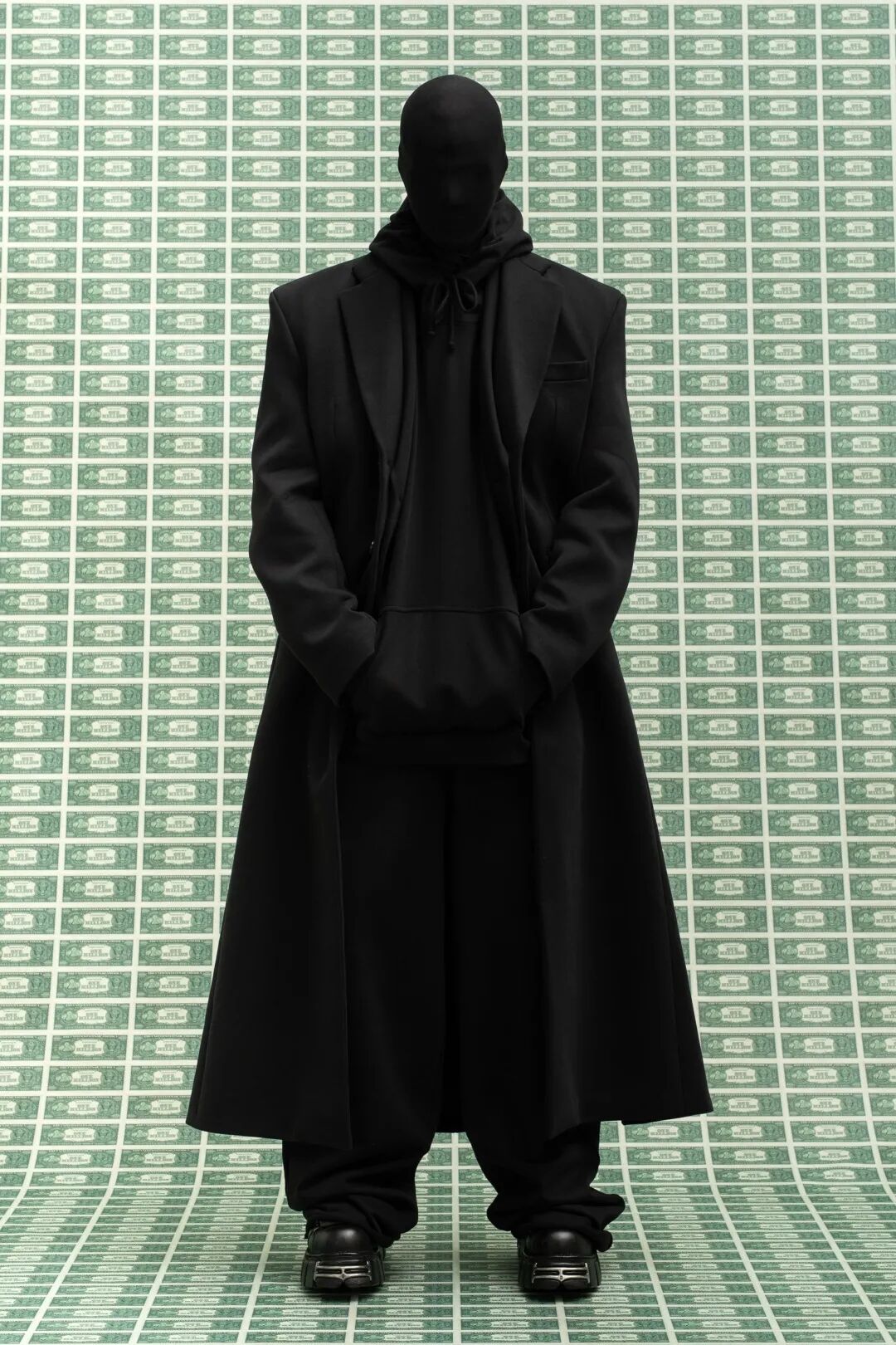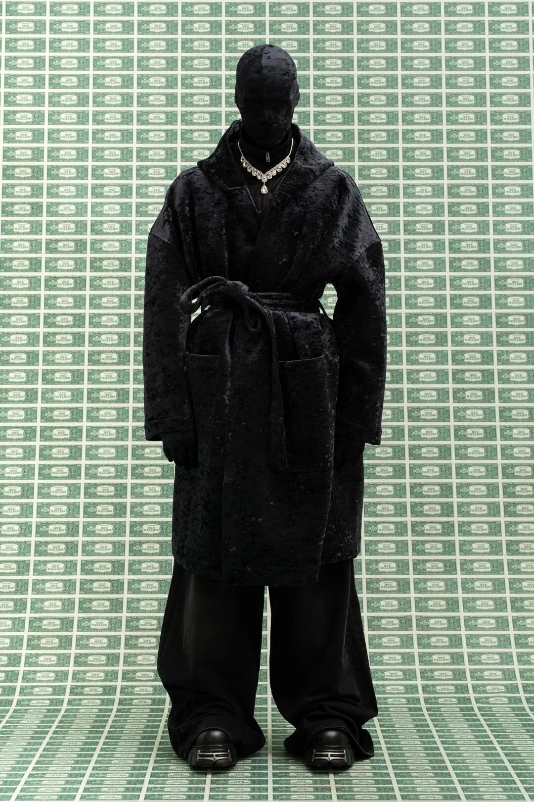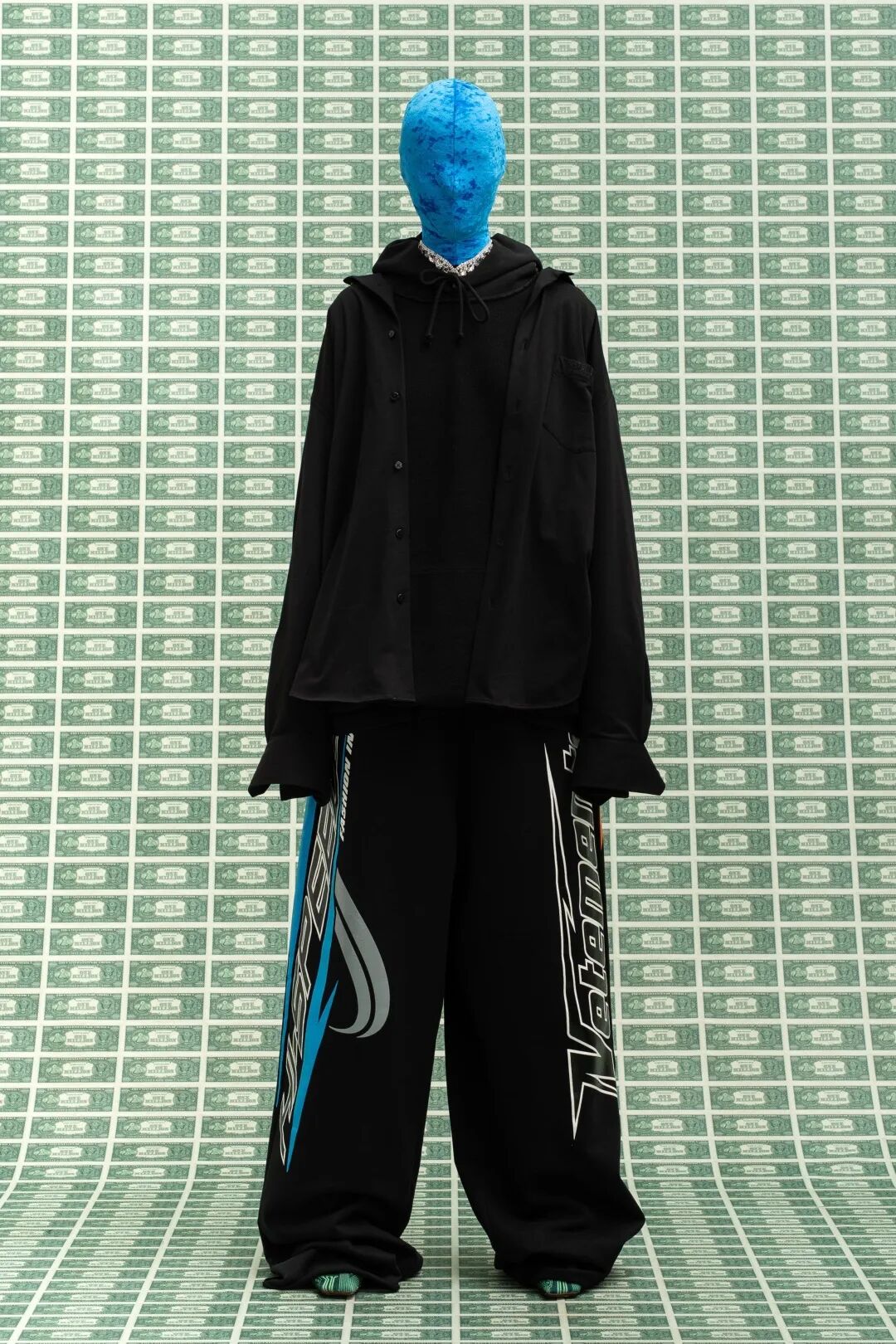 Guram Gvasalia设计了带有内置拉链的羽绒服和牛仔裤,可供自由修改轮廓。72 套造型中除了 1 个以外都戴着 Vetements 标志性套头面具,以表达数字时代重塑了奢侈品的概念。