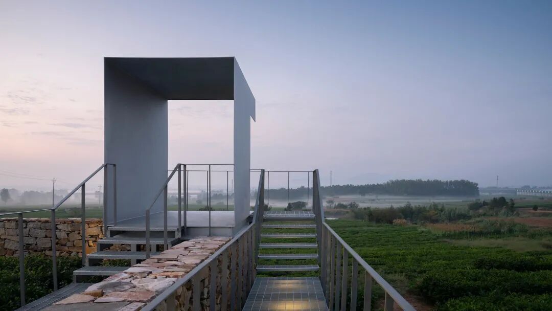 山东省日照市岚山区巨峰镇,是一个北方茶乡,在乡镇北部的朝元山南麓,一条彩虹公路沿着山腰蜿蜒而过,从路上,可仰望青山松翠,亦可俯瞰层层茶园。在山间小湖的转折之处,风景绝佳,可做驻留之所,拟作景观小亭。