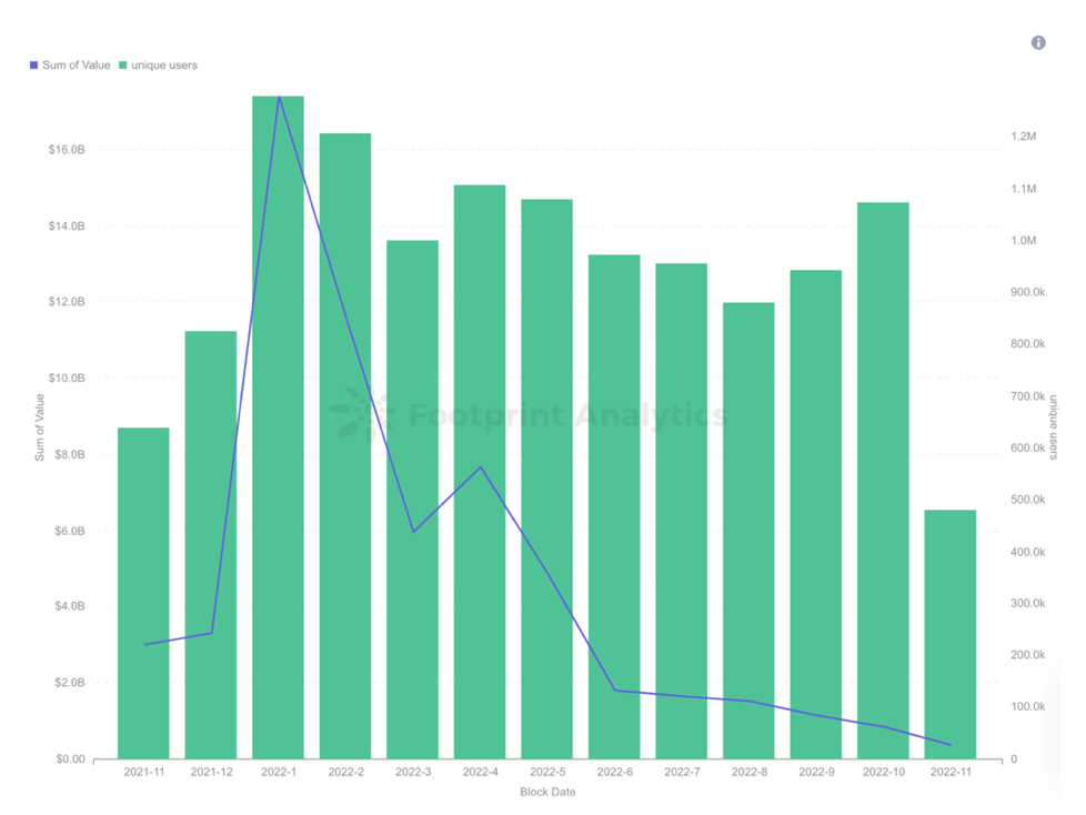 NFT市场的清洗交易量接近真实交易量的一半。 洗盘用户数占总用户数近46%。
