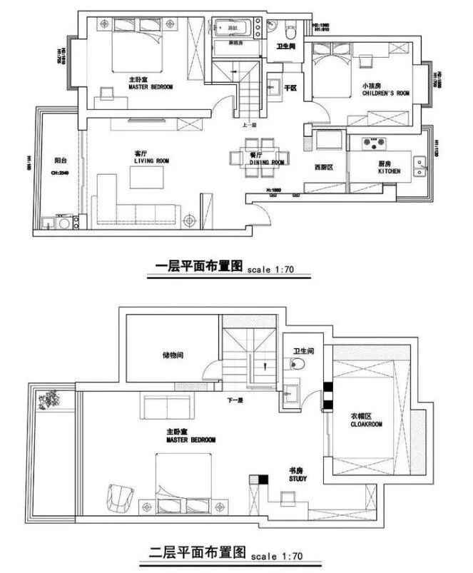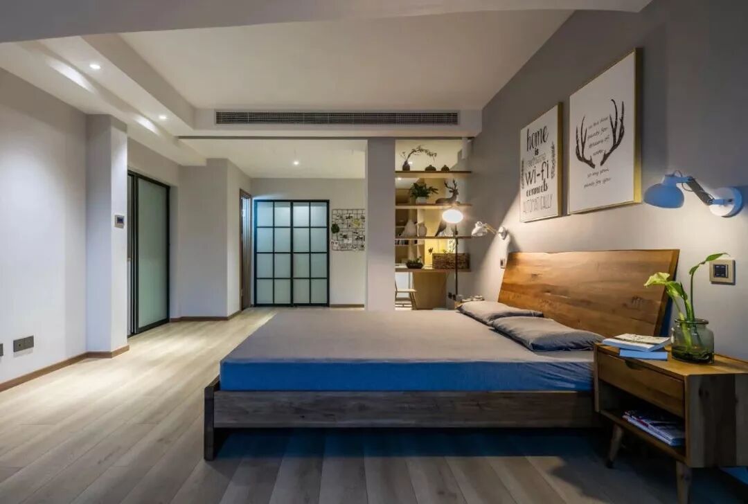 二楼大部分的空间被作为了开放式的卧室,卧室和书房之间有一根柱子,加上隔板之后正好作为隔断使用。二楼还有个独立的衣帽间和储物间,让屋主不用担心收纳空间不足。