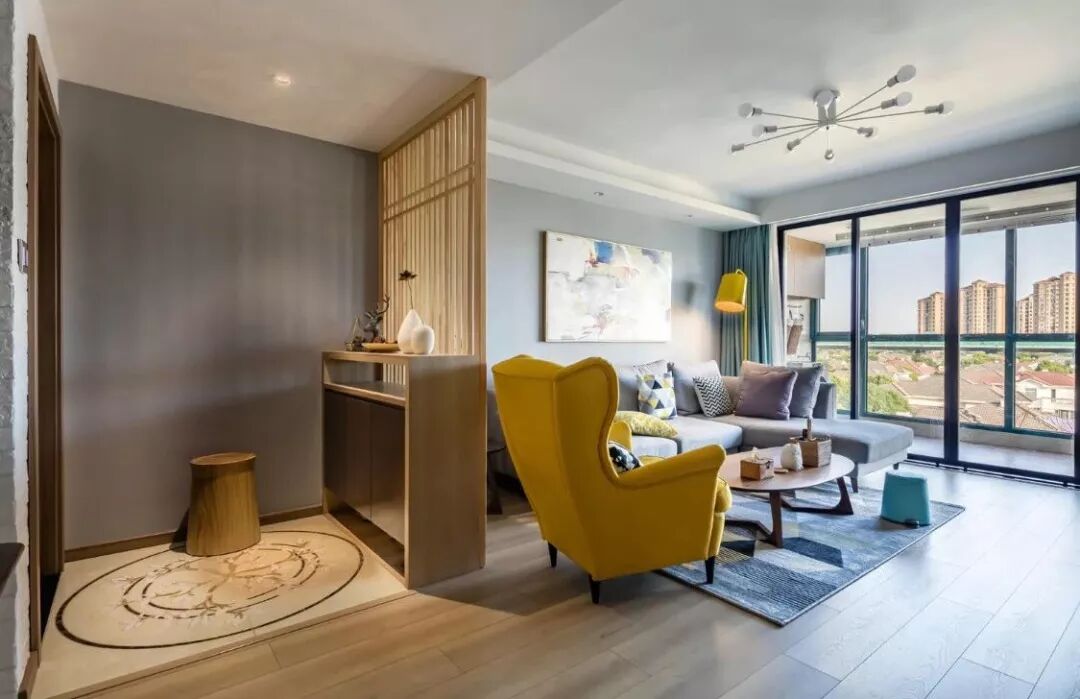 入户没有玄关走廊的户型,在入户门和客厅之间做了个柜子加隔断的设计,既可以避免风水问题,又能隔离出一个独立的玄关出来。