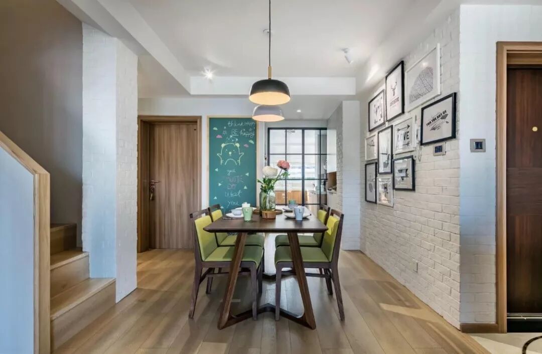 在入户门的另一侧就是餐厅空间,餐厅背景墙做了文化砖加上照片墙的设计,搭配原木风的餐桌椅和青色黑板墙,让人感觉文艺范十足。