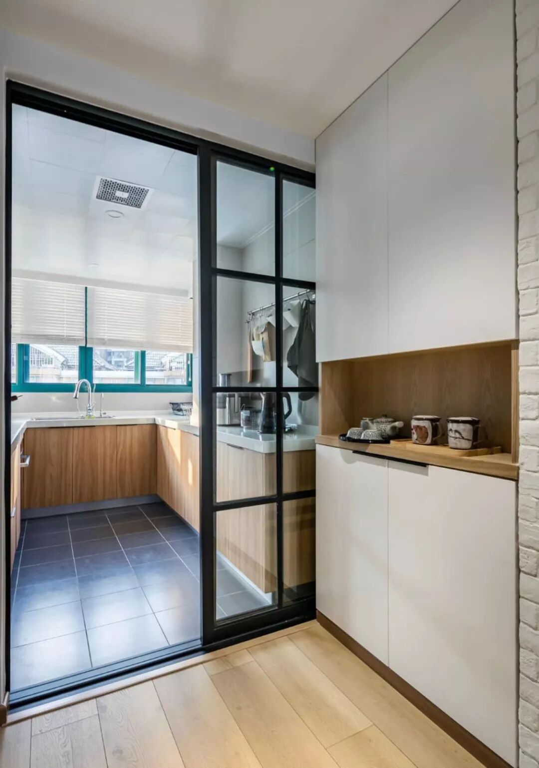 厨房和餐厅之间用黑框玻璃推拉门作为隔断,黑色的地砖搭配原木色的橱柜、白色的墙砖,让厨房层次分明。大面积的窗户也给厨房带来了充足的光线。