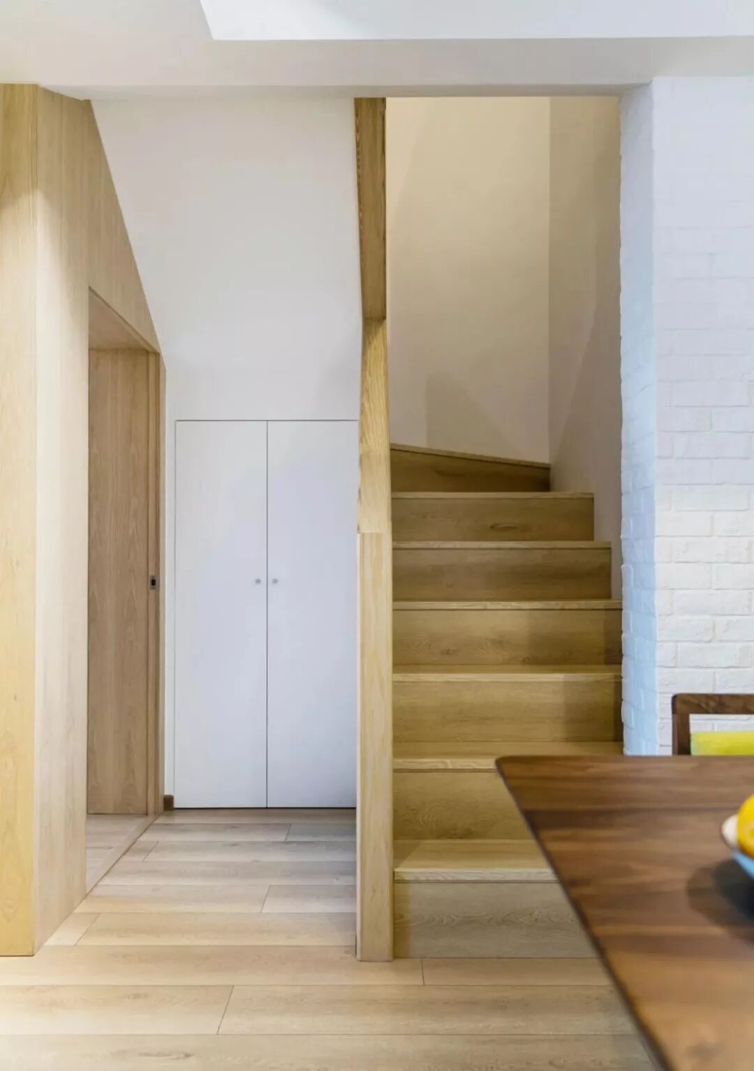 通往二楼的楼梯底部被充分利用起来做了柜子,通体木色的楼梯扶手和踏步,搭配白色的墙面、柜子,显得惬意十足。