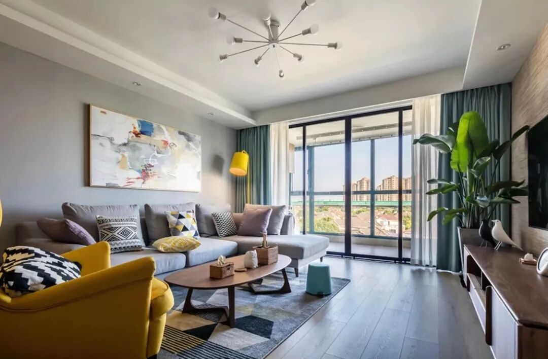 灰色的L型布艺沙发搭配沙发背景墙上的抽象挂画和地面的几何拼色地毯,客厅整体给人一种艺术而又优雅的感觉。