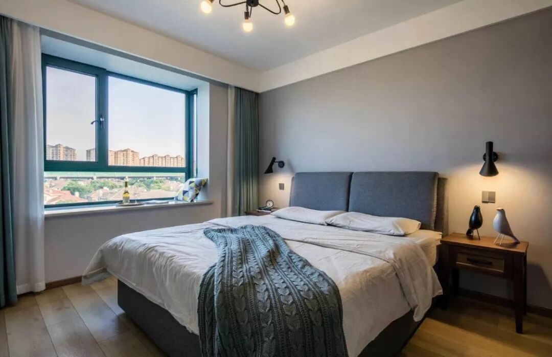 一楼卧室的床头背景墙直接刷成了灰色,床头两侧也做了对称的设计。灰色的床头靠背搭配粉蓝色的窗帘,显得轻松而又舒适。