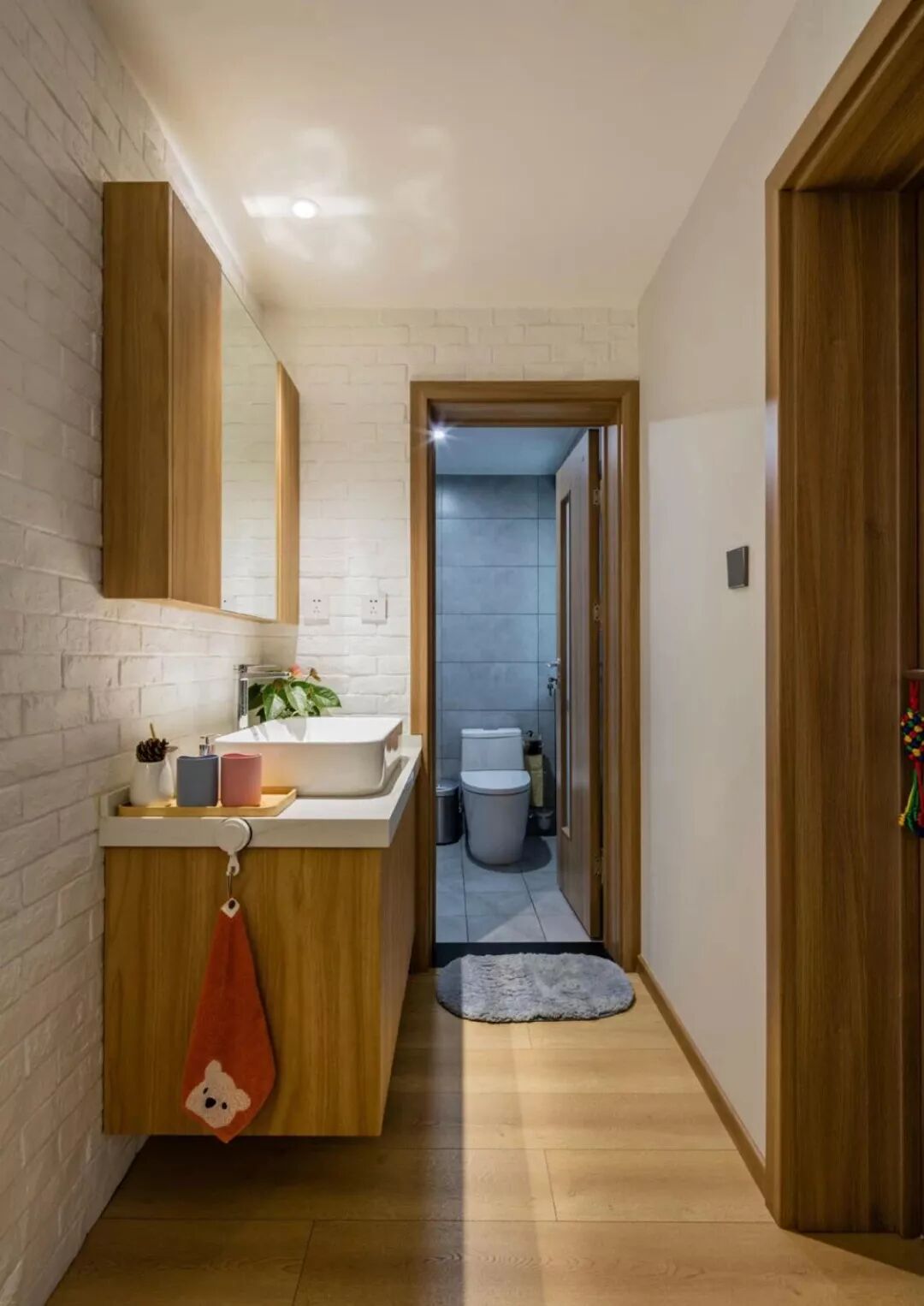 一楼的卫生间把洗手台放在了门外,更方便一家人平时的使用。镜柜加上藏光的设计搭配白色文化砖,让这个采光不好的走廊空间,也显得格外明亮。