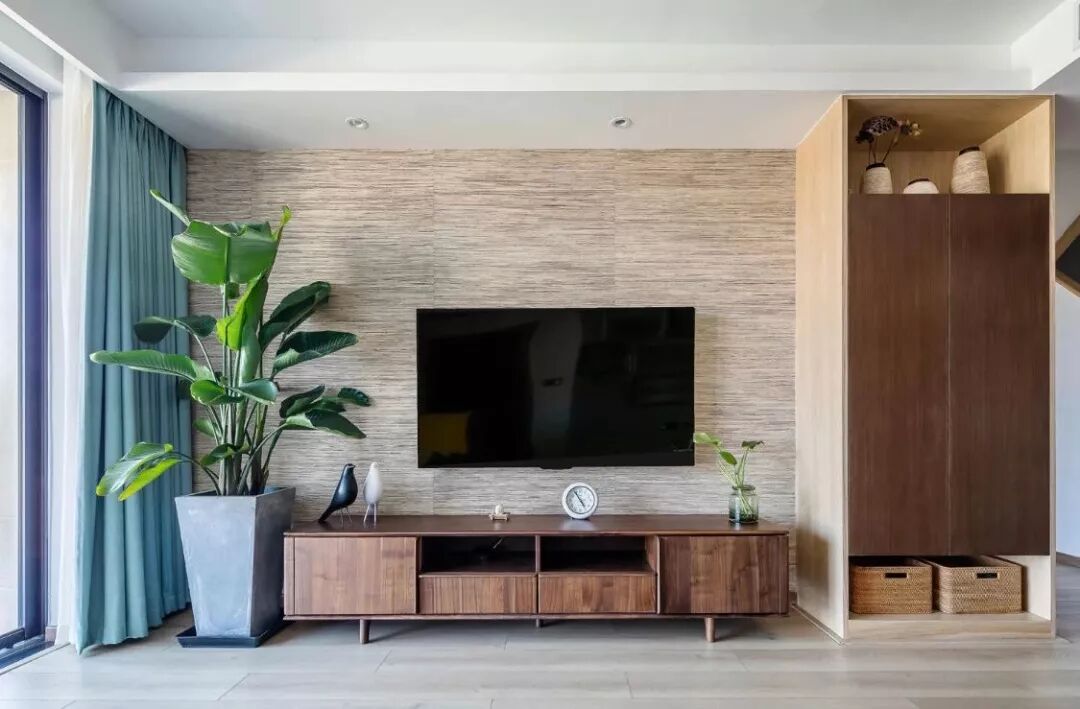 电视背景墙上直接铺上了墙砖,做旧款的电视背景墙柜搭配水泥花盆的绿植,显得复古而又自然。电视背景墙侧方的柜子,满足客厅的收纳需求。