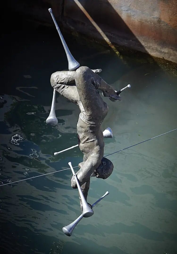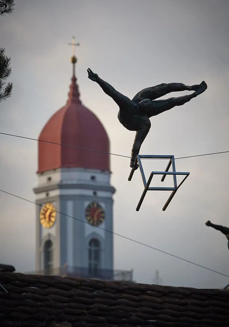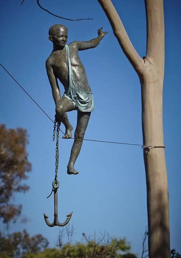 不过,不用担心这些雕塑的安全问题,看起来这些走钢丝的雕塑非常危险,随时都有被风吹下来的可能,或者是钢丝支撑不住雕塑的重量而断裂的可能。我们所担心的事,正是艺术家刻意的设计,从这些摇摇欲坠的雕塑中,隐藏着艺术家的思考。