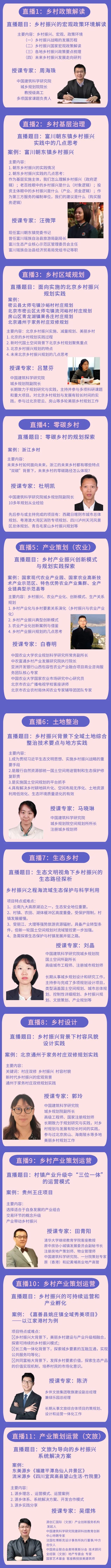 11位专家全直播,总学习周期为1个月,每周2-3次直播,分为政策解读、土地整治、区域规划、基层治理、零碳乡村、产业策划运营等几个方面,北京、广西、浙江、贵州、福建、四川等地的乡村振兴案例分享,具体直播内容及列表如下: